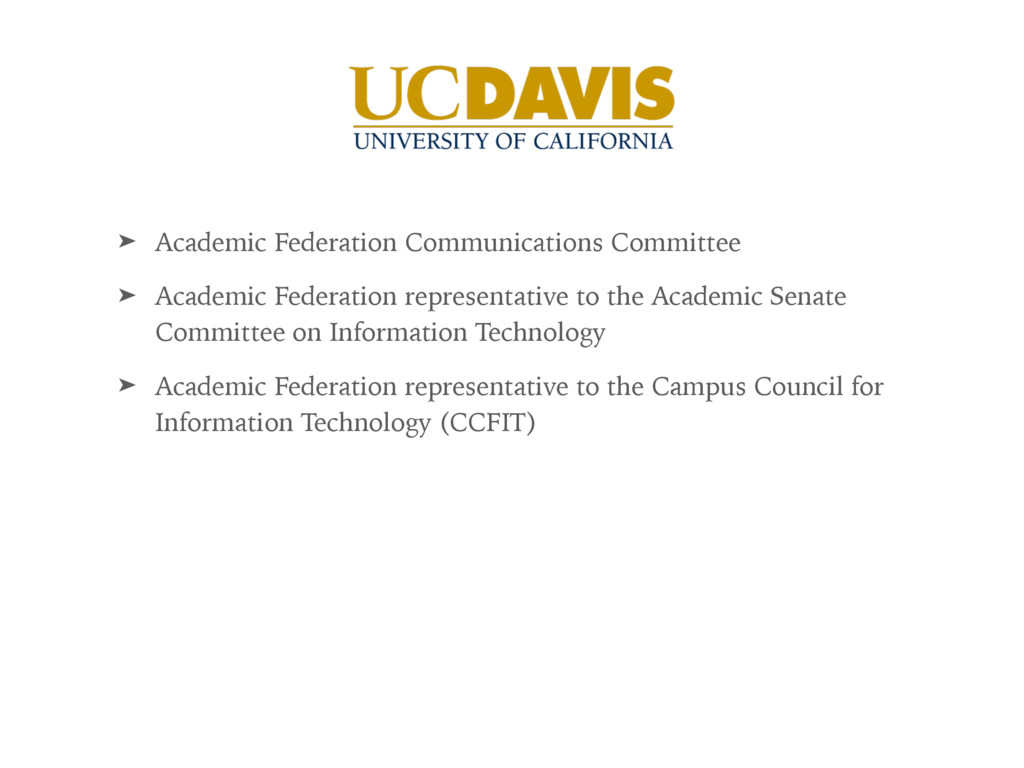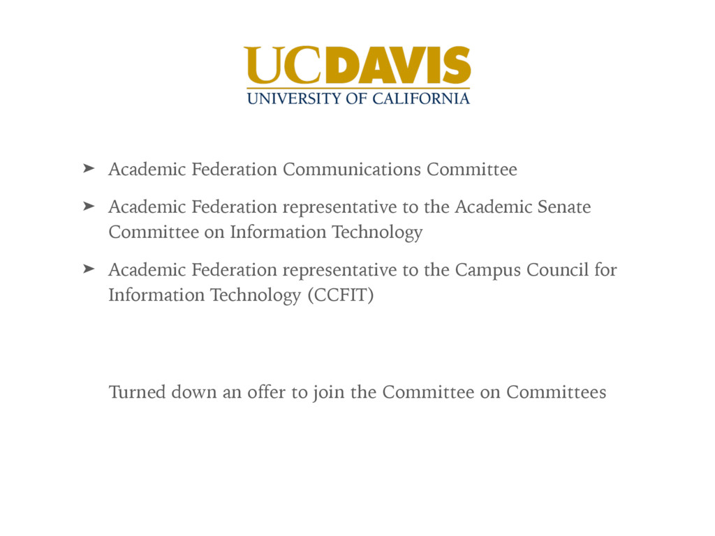 the Academic Senate Committee on Information Technology ➤ Academic Federation representative to the Campus Council for Information Technology (CCFIT) Turned down an offer to join the Committee on Committees