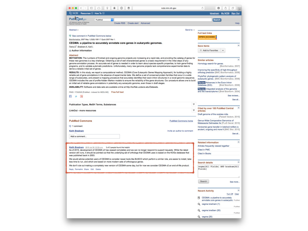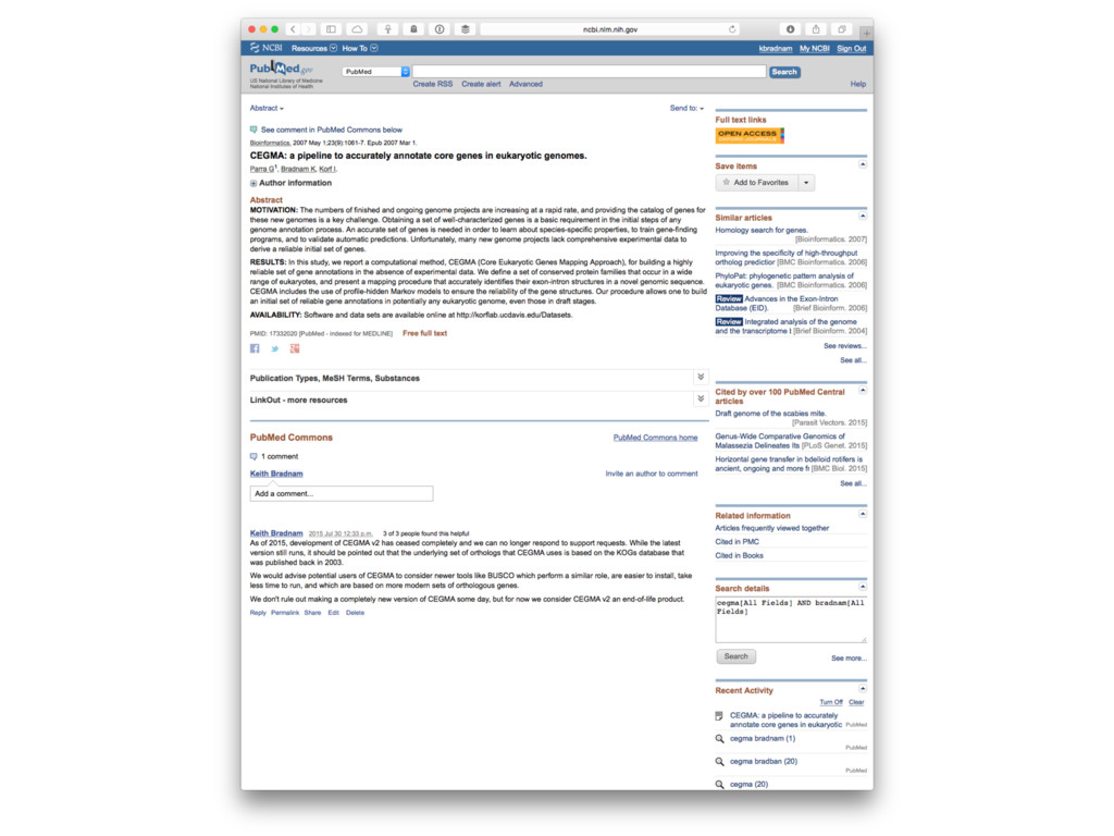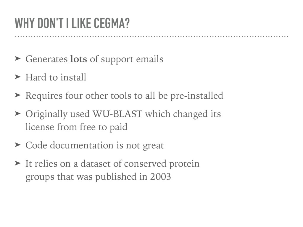 emails ➤ Hard to install ➤ Requires four other tools to all be pre-installed ➤ Originally used WU-BLAST which changed its license from free to paid ➤ Code documentation is not great ➤ It relies on a dataset of conserved protein groups that was published in 2003