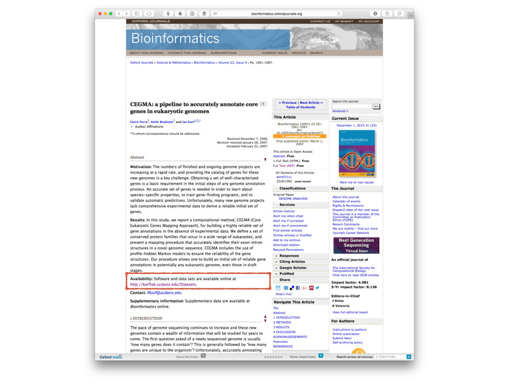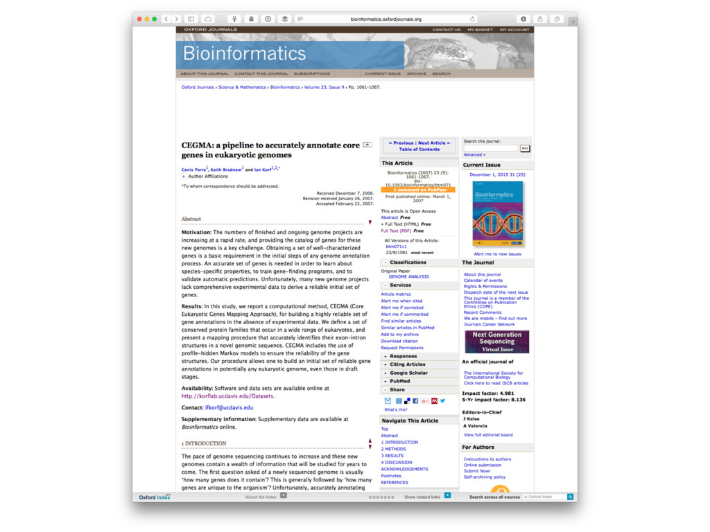 Molecular and Cellular Biology 182. Computational approaches to model and analyze biological information about genomes, transcriptomes, and proteomes. Topics include genome assembly and annotation, mRNA and small RNA profiling, proteomics, protein-DNA and protein-protein interactions, network analysis, and comparative genomics. Computer programming experience not required. Brady, Dawson, Dinesh-Kumar, Harada, Korf, Maloof, Comai Course first started April 1, 2013