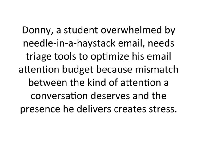 “totally outdated”: “I don’t know, it’s like nostalgic. I don’t want to unsubscribe from them. But I also don’t want to get their emails.” – Donny • “There’s all sorts of things…requests that will take me 2 hours or 2 days to fulfill. Am I supposed to stop and do that now?” –Dave • “I’ll go through and delete them all first [the “everything else” category] and then I’ll go back to what I actually want to read” –Mike