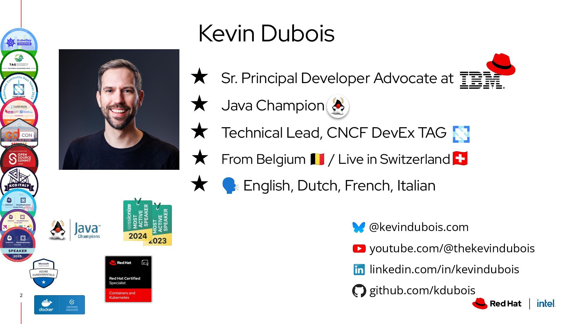 Champion ★ Technical Lead, CNCF DevEx TAG ★ From Belgium 󰎐 / Live in Switzerland󰎤 ★ 🗣 English, Dutch, French, Italian youtube.com/@thekevindubois linkedin.com/in/kevindubois github.com/kdubois @kevindubois.com 2