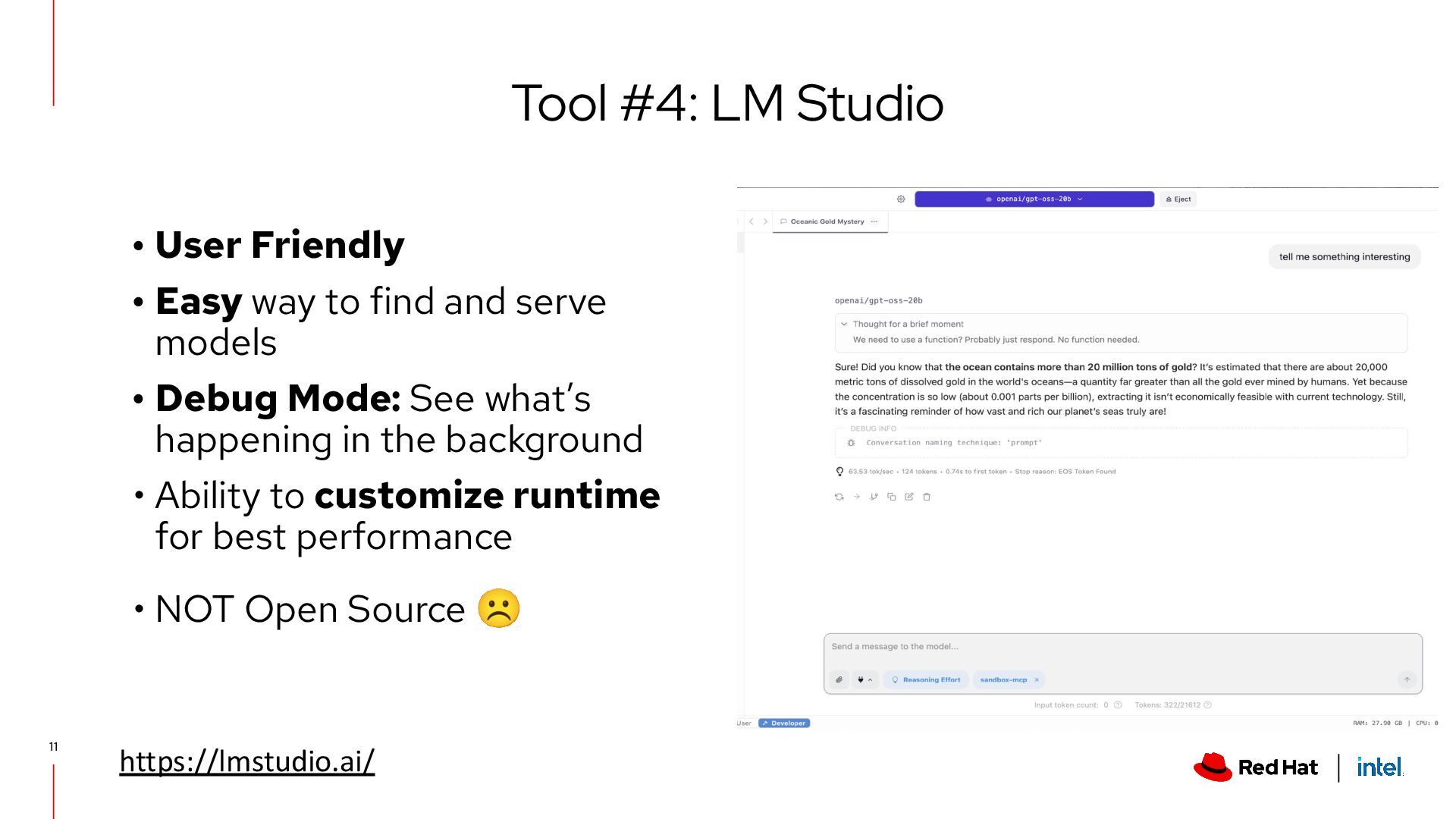 models • Debug Mode: See what’s happening in the background • Ability to customize runtime for best performance • NOT Open Source ☹ Tool #4: LM Studio https://lmstudio.ai/ 11