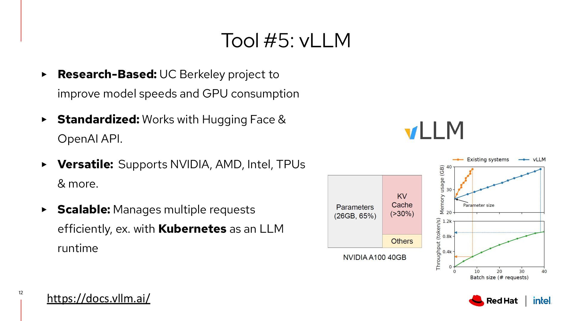 GPU consumption ▸ Standardized: Works with Hugging Face & OpenAI API. ▸ Versatile: Supports NVIDIA, AMD, Intel, TPUs & more. ▸ Scalable: Manages multiple requests efficiently, ex. with Kubernetes as an LLM runtime Tool #5: vLLM https://docs.vllm.ai/ 12
