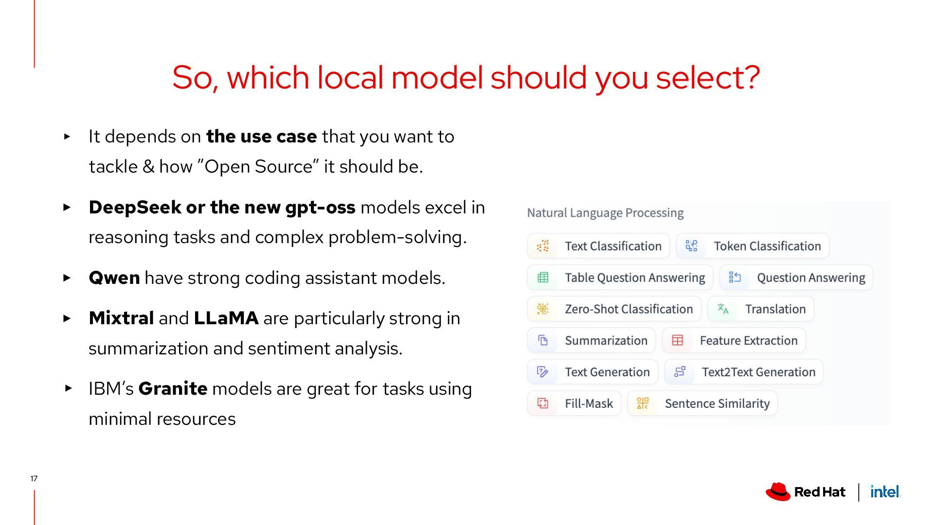 to tackle & how ”Open Source” it should be. ▸ DeepSeek or the new gpt-oss models excel in reasoning tasks and complex problem-solving. ▸ Qwen have strong coding assistant models. ▸ Mixtral and LLaMA are particularly strong in summarization and sentiment analysis. ▸ IBM’s Granite models are great for tasks using minimal resources So, which local model should you select? 17