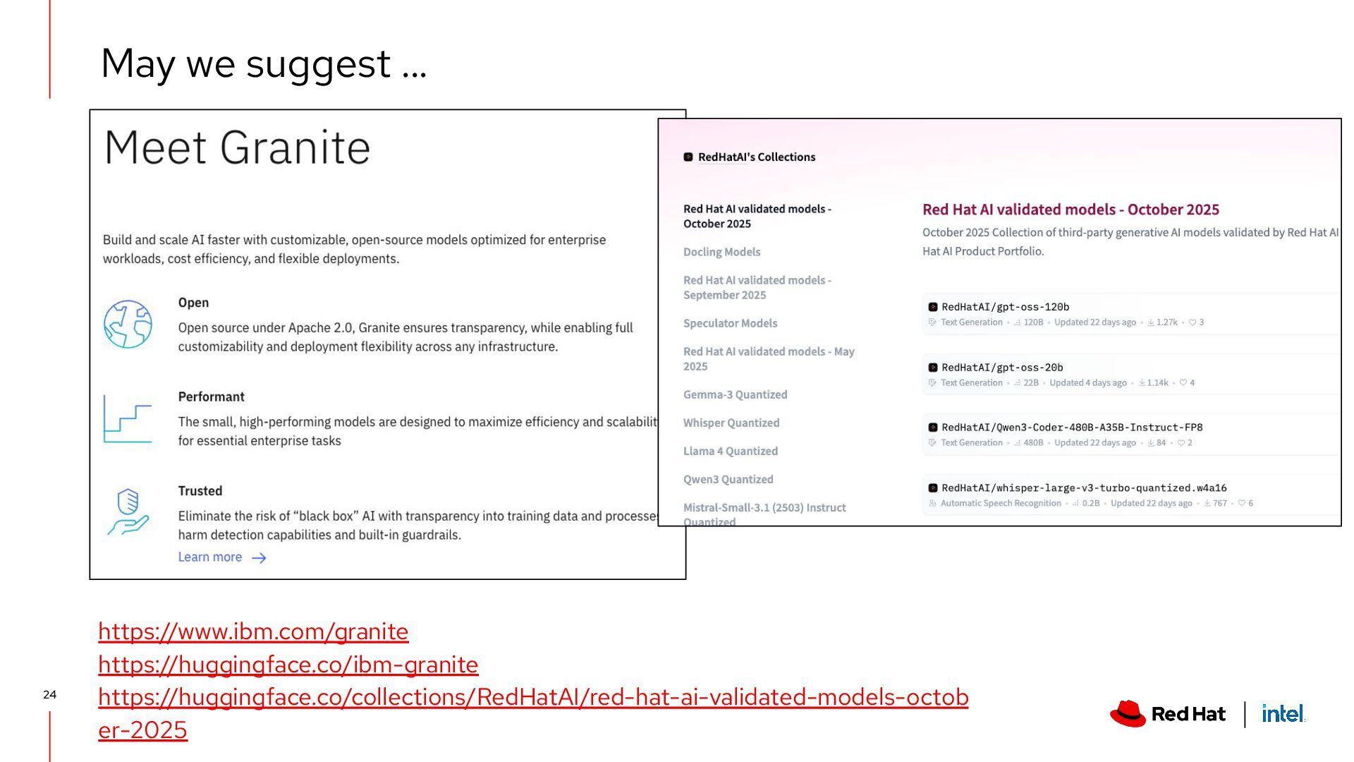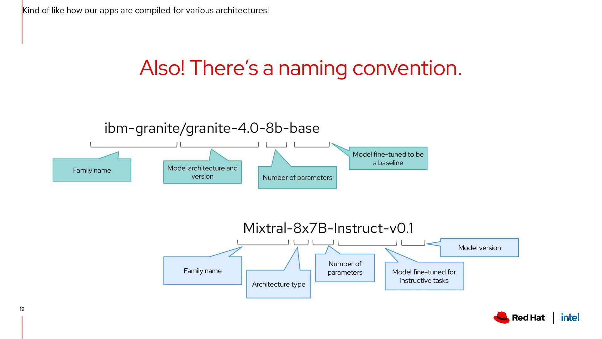 architectures! Also! There’s a naming convention. ibm-granite/granite-4.0-8b-base Family name Model architecture and version Number of parameters Model fine-tuned to be a baseline Mixtral-8x7B-Instruct-v0.1 Family name Model version Number of parameters Model fine-tuned for instructive tasks Architecture type 19