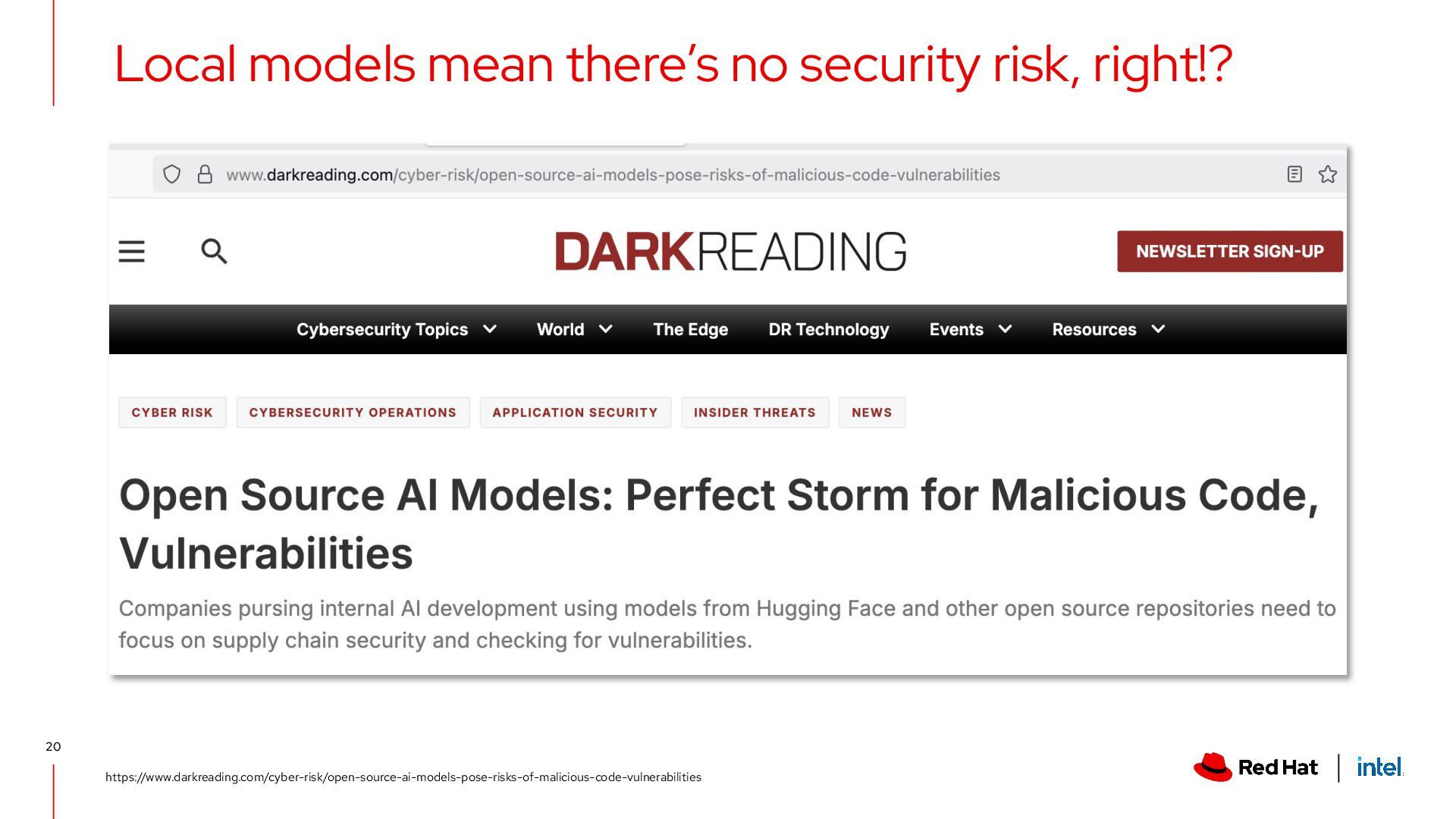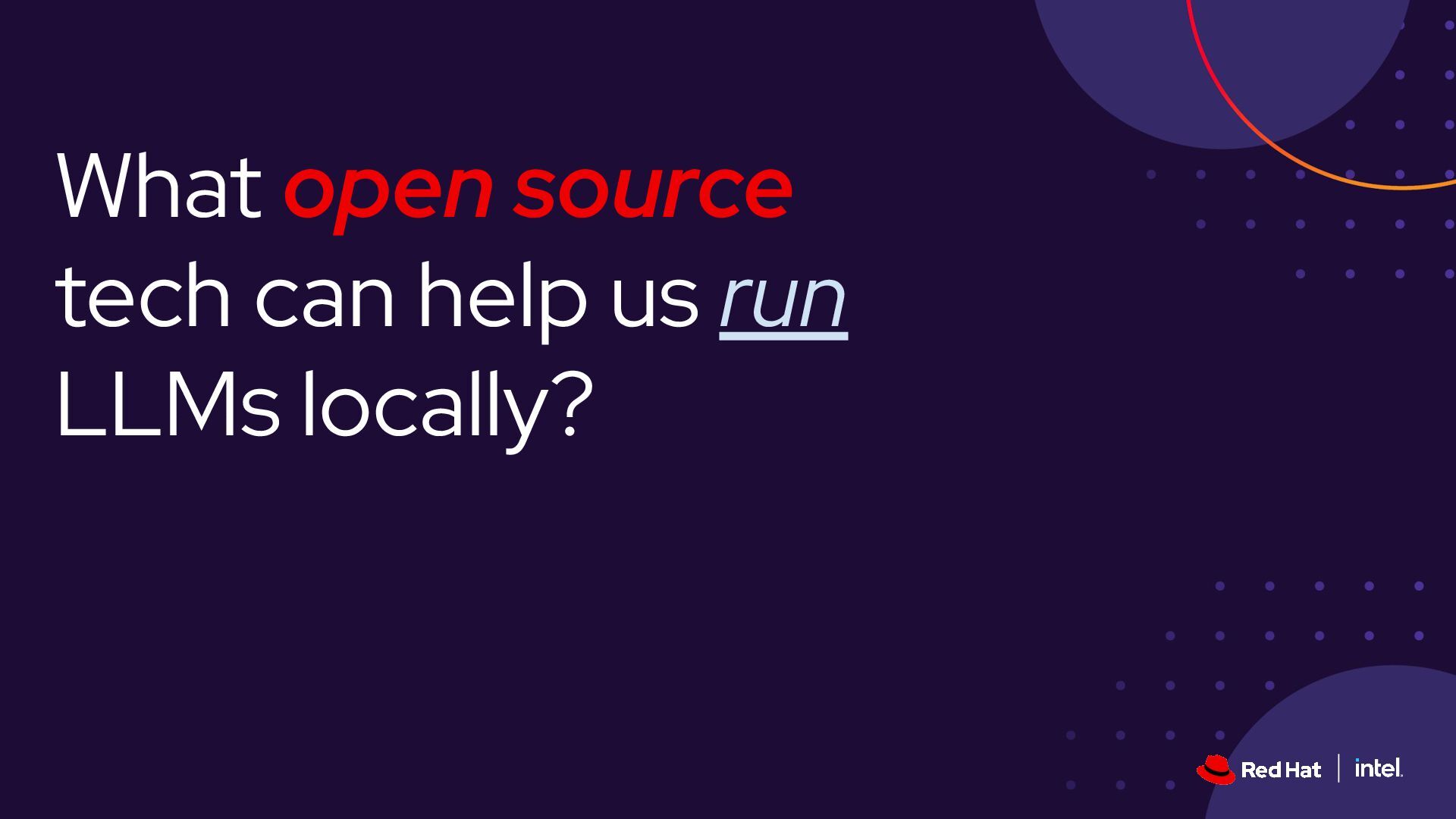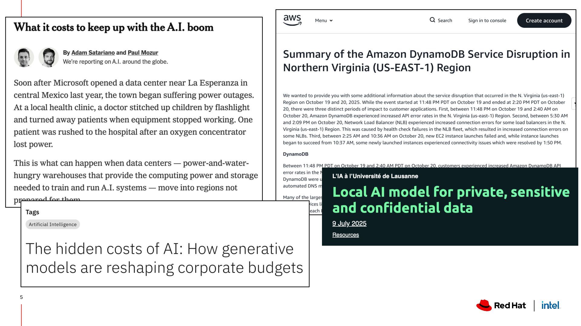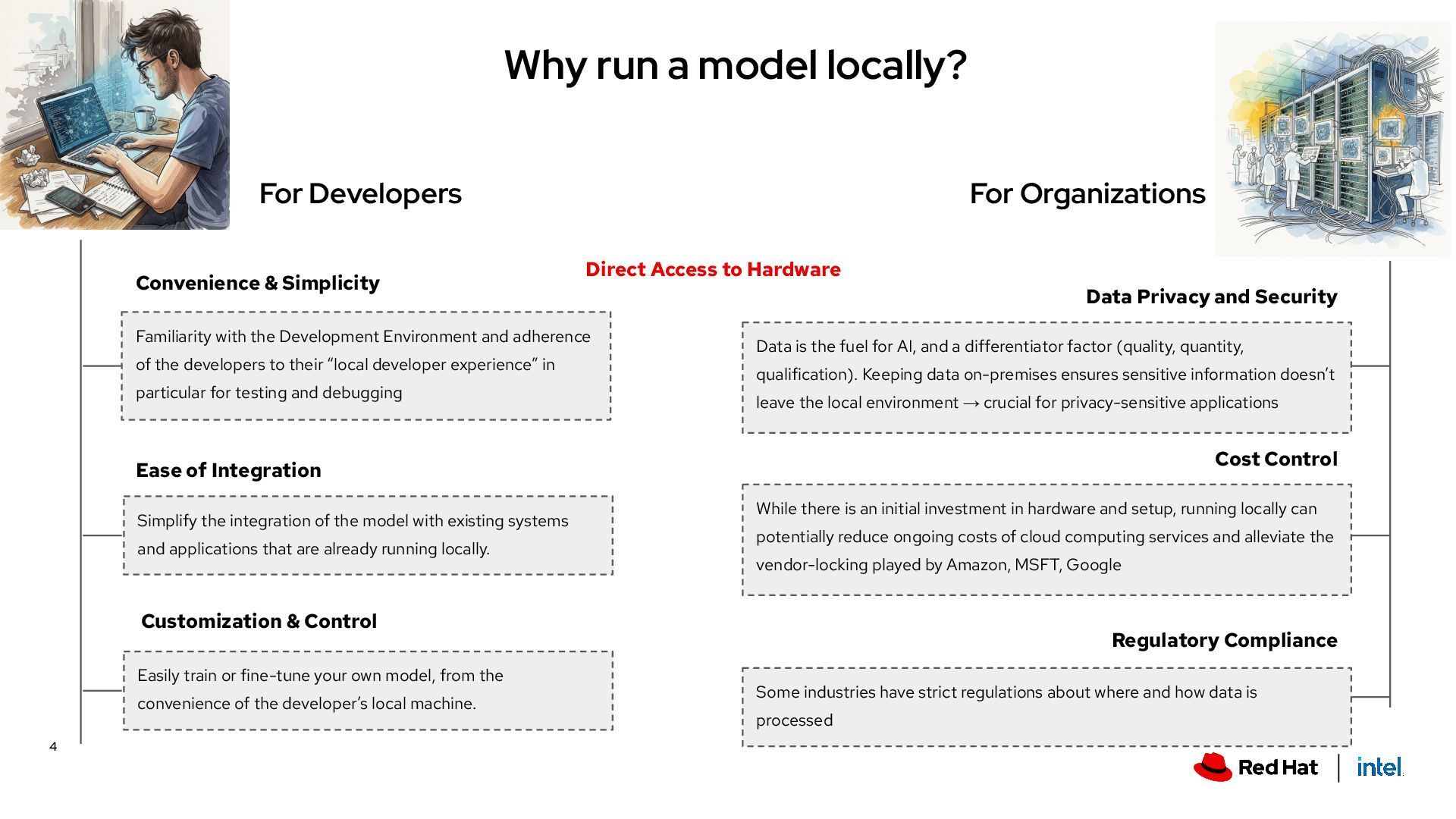 Development Environment and adherence of the developers to their “local developer experience” in particular for testing and debugging Convenience & Simplicity Direct Access to Hardware Ease of Integration Simplify the integration of the model with existing systems and applications that are already running locally. For Organizations Data Privacy and Security Data is the fuel for AI, and a differentiator factor (quality, quantity, qualification). Keeping data on-premises ensures sensitive information doesn’t leave the local environment → crucial for privacy-sensitive applications Cost Control While there is an initial investment in hardware and setup, running locally can potentially reduce ongoing costs of cloud computing services and alleviate the vendor-locking played by Amazon, MSFT, Google Regulatory Compliance Some industries have strict regulations about where and how data is processed Customization & Control Easily train or fine-tune your own model, from the convenience of the developer’s local machine. 4