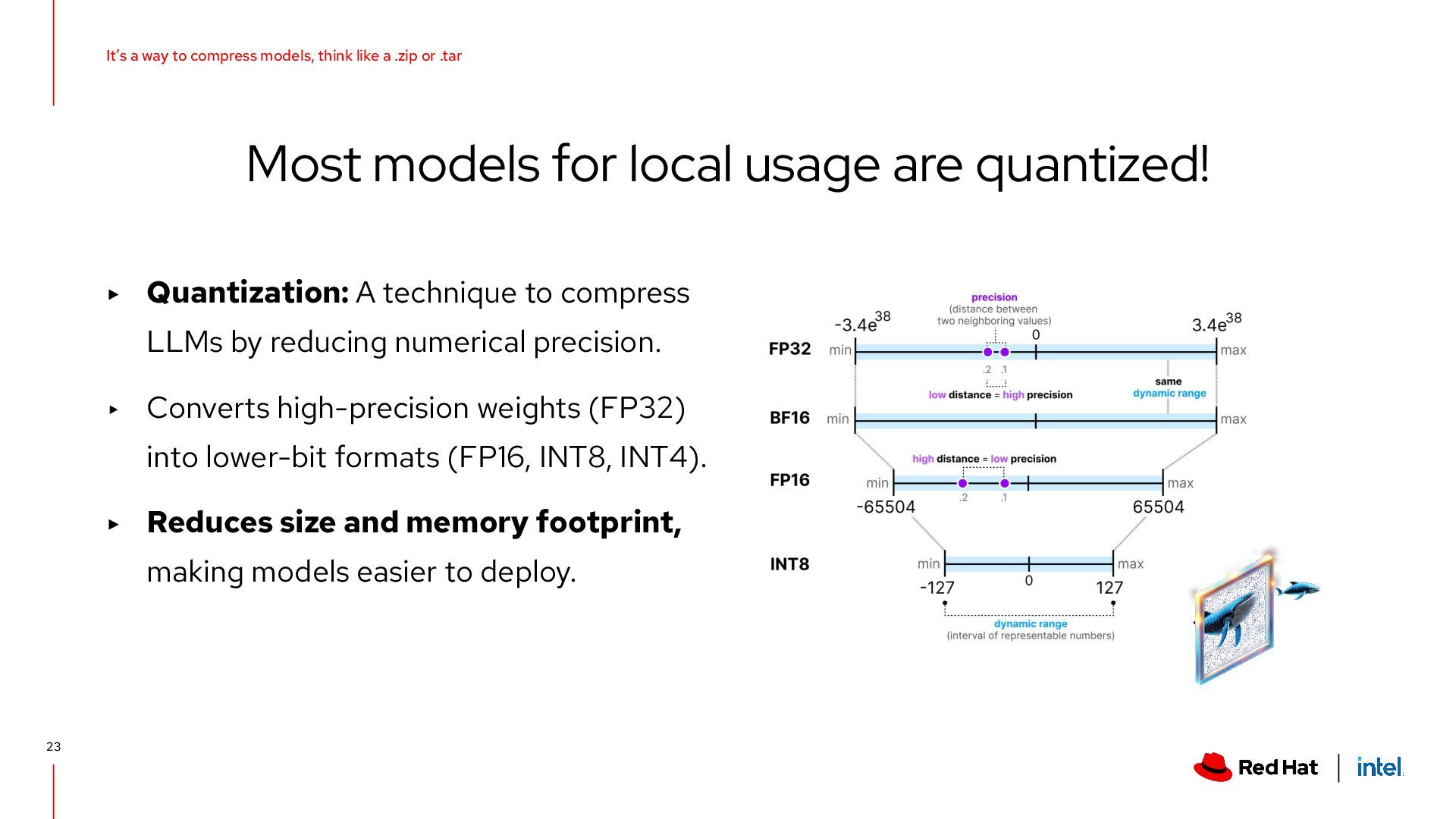 precision. ▸ Converts high-precision weights (FP32) into lower-bit formats (FP16, INT8, INT4). ▸ Reduces size and memory footprint, making models easier to deploy. Most models for local usage are quantized! 23 It’s a way to compress models, think like a .zip or .tar