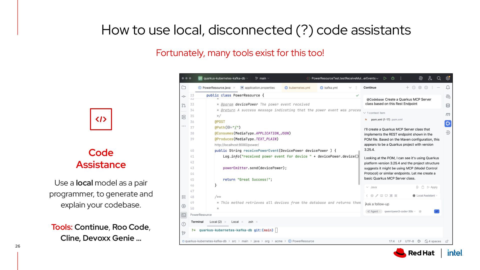 to generate and explain your codebase. Tools: Continue, Roo Code, Cline, Devoxx Genie … How to use local, disconnected (?) code assistants Fortunately, many tools exist for this too! 26