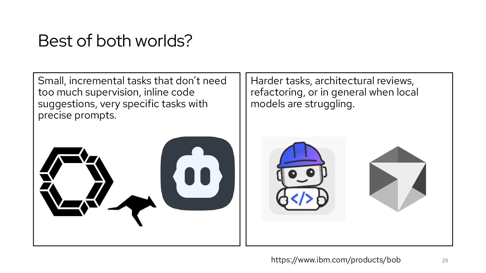 too much supervision, inline code suggestions, very specific tasks with precise prompts. 29 Harder tasks, architectural reviews, refactoring, or in general when local models are struggling. https://www.ibm.com/products/bob