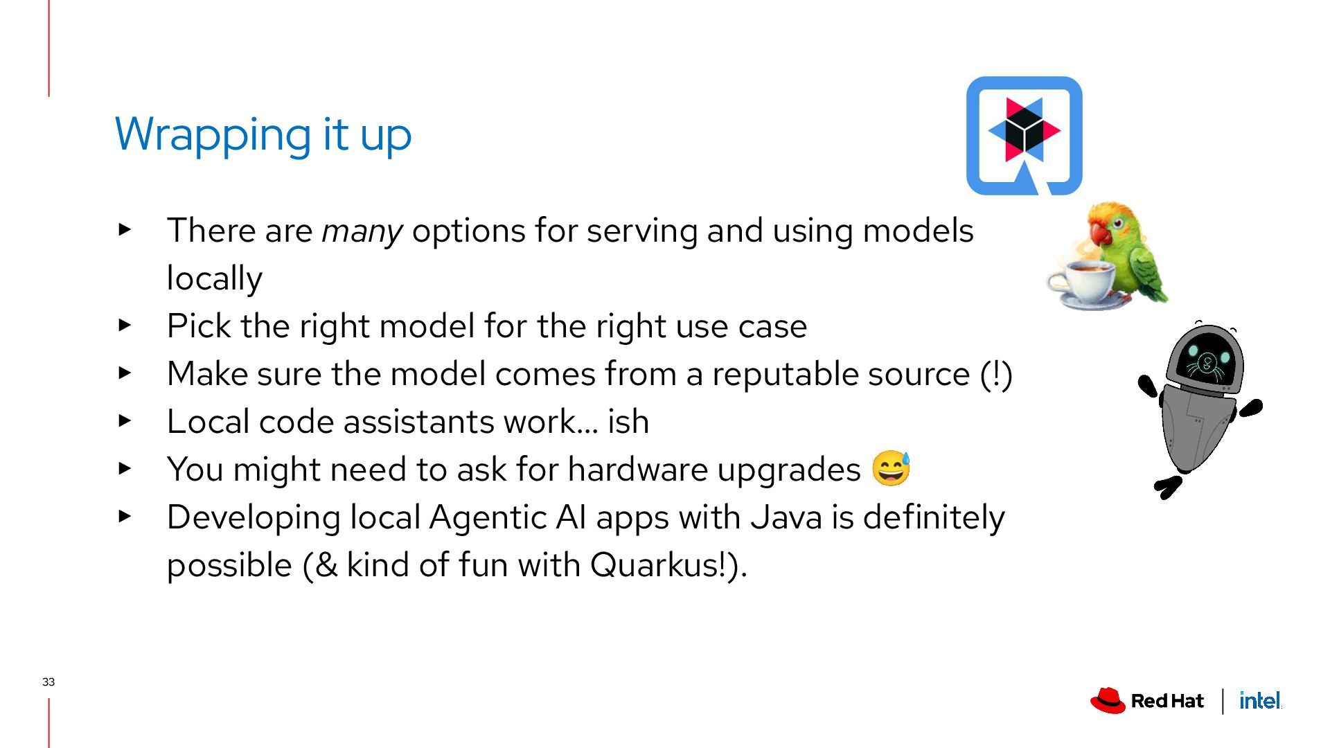 locally ▸ Pick the right model for the right use case ▸ Make sure the model comes from a reputable source (!) ▸ Local code assistants work… ish ▸ You might need to ask for hardware upgrades 😅 ▸ Developing local Agentic AI apps with Java is definitely possible (& kind of fun with Quarkus!). Wrapping it up 33
