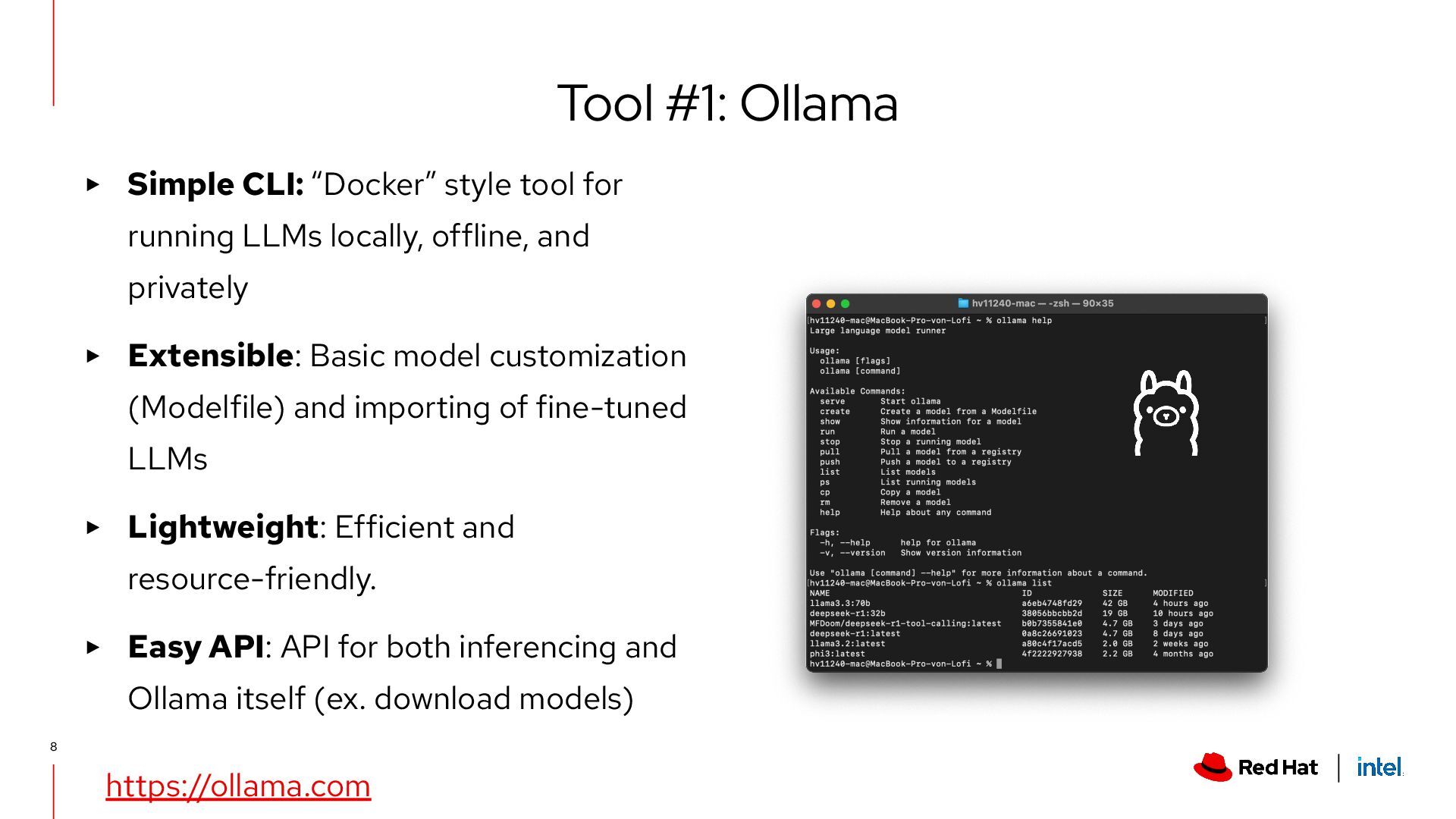 offline, and privately ▸ Extensible: Basic model customization (Modelfile) and importing of fine-tuned LLMs ▸ Lightweight: Efficient and resource-friendly. ▸ Easy API: API for both inferencing and Ollama itself (ex. download models) Tool #1: Ollama https://ollama.com 8