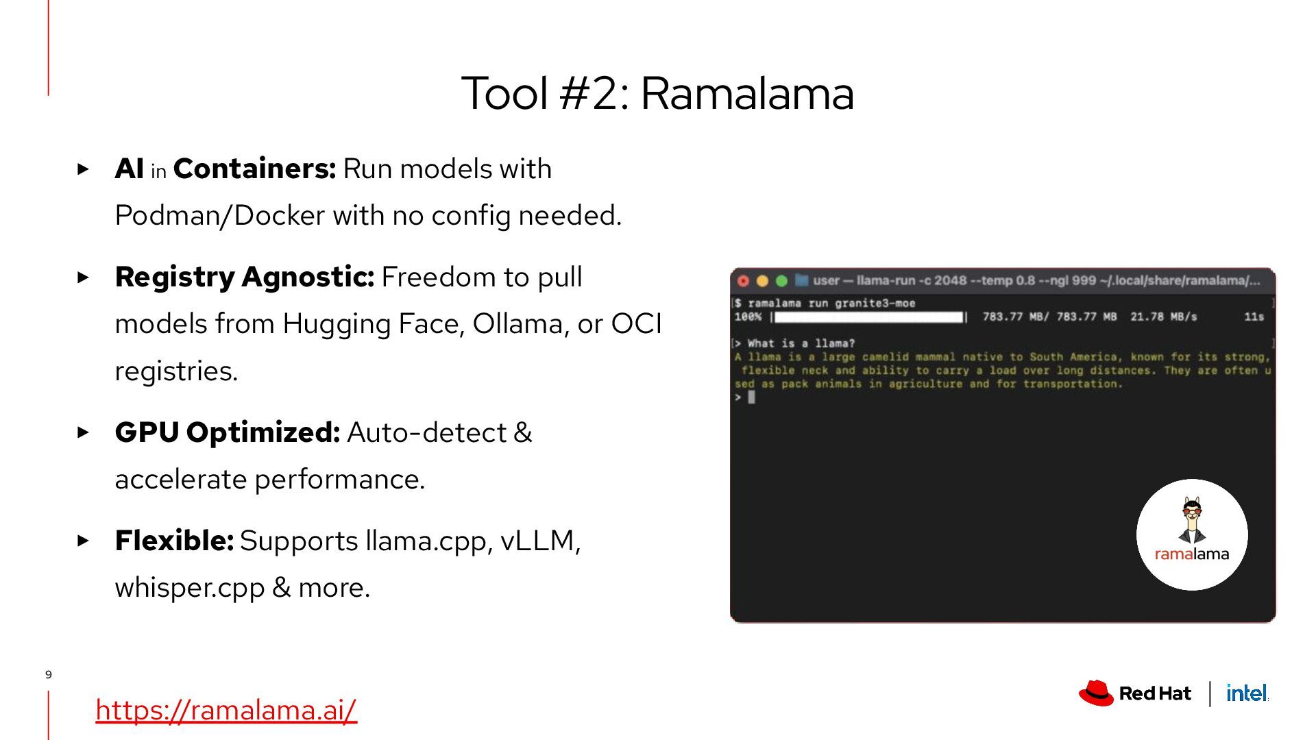 config needed. ▸ Registry Agnostic: Freedom to pull models from Hugging Face, Ollama, or OCI registries. ▸ GPU Optimized: Auto-detect & accelerate performance. ▸ Flexible: Supports llama.cpp, vLLM, whisper.cpp & more. Tool #2: Ramalama https://ramalama.ai/ 9