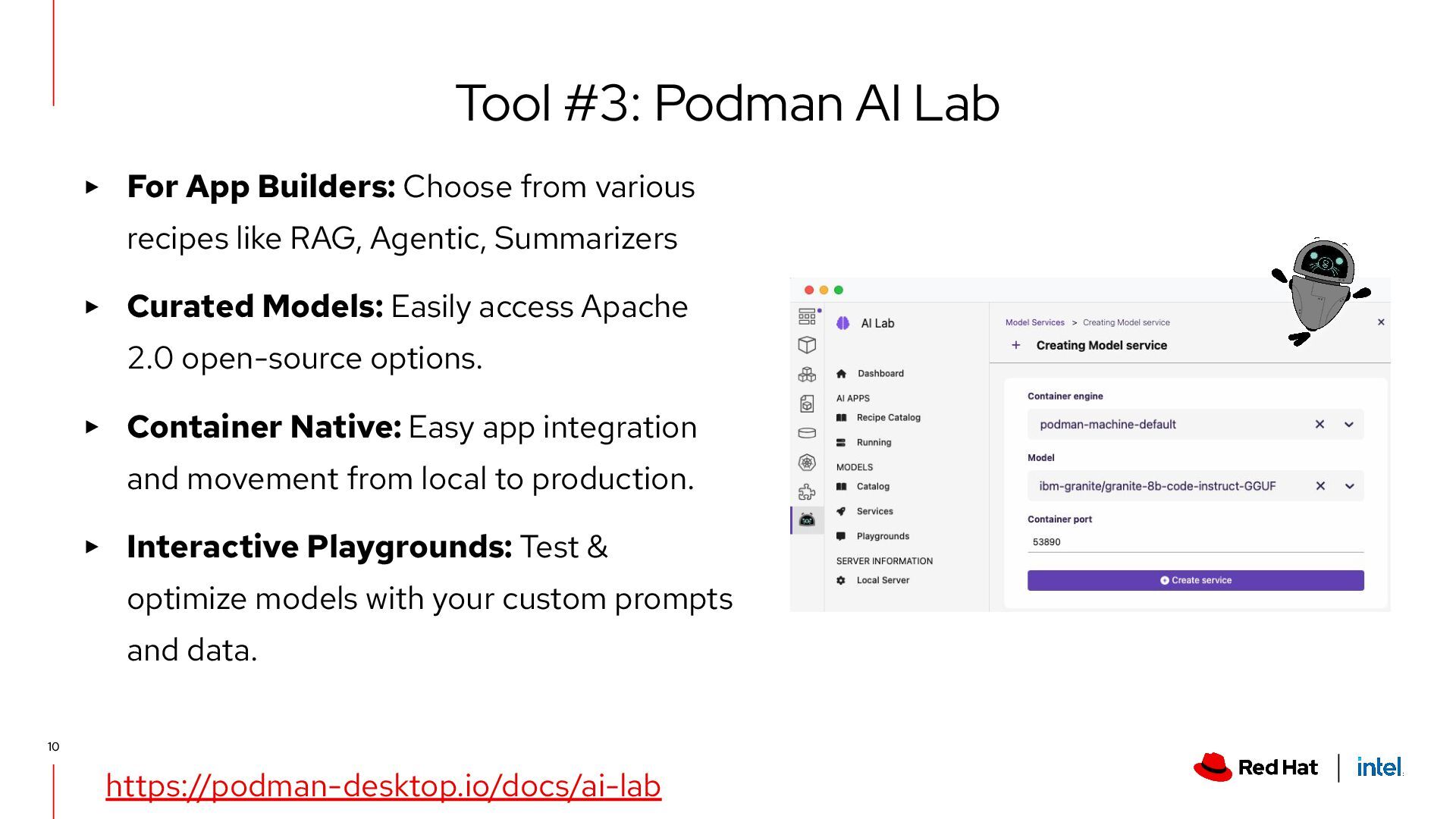 Agentic, Summarizers ▸ Curated Models: Easily access Apache 2.0 open-source options. ▸ Container Native: Easy app integration and movement from local to production. ▸ Interactive Playgrounds: Test & optimize models with your custom prompts and data. Tool #3: Podman AI Lab https://podman-desktop.io/docs/ai-lab 10