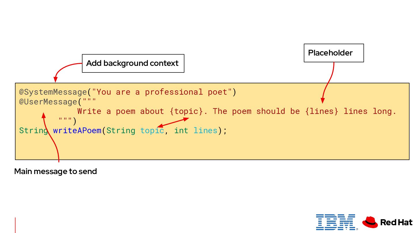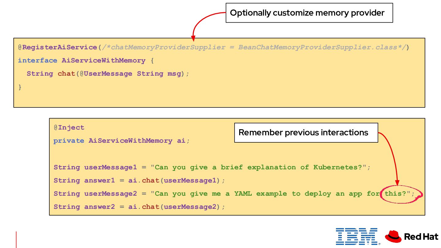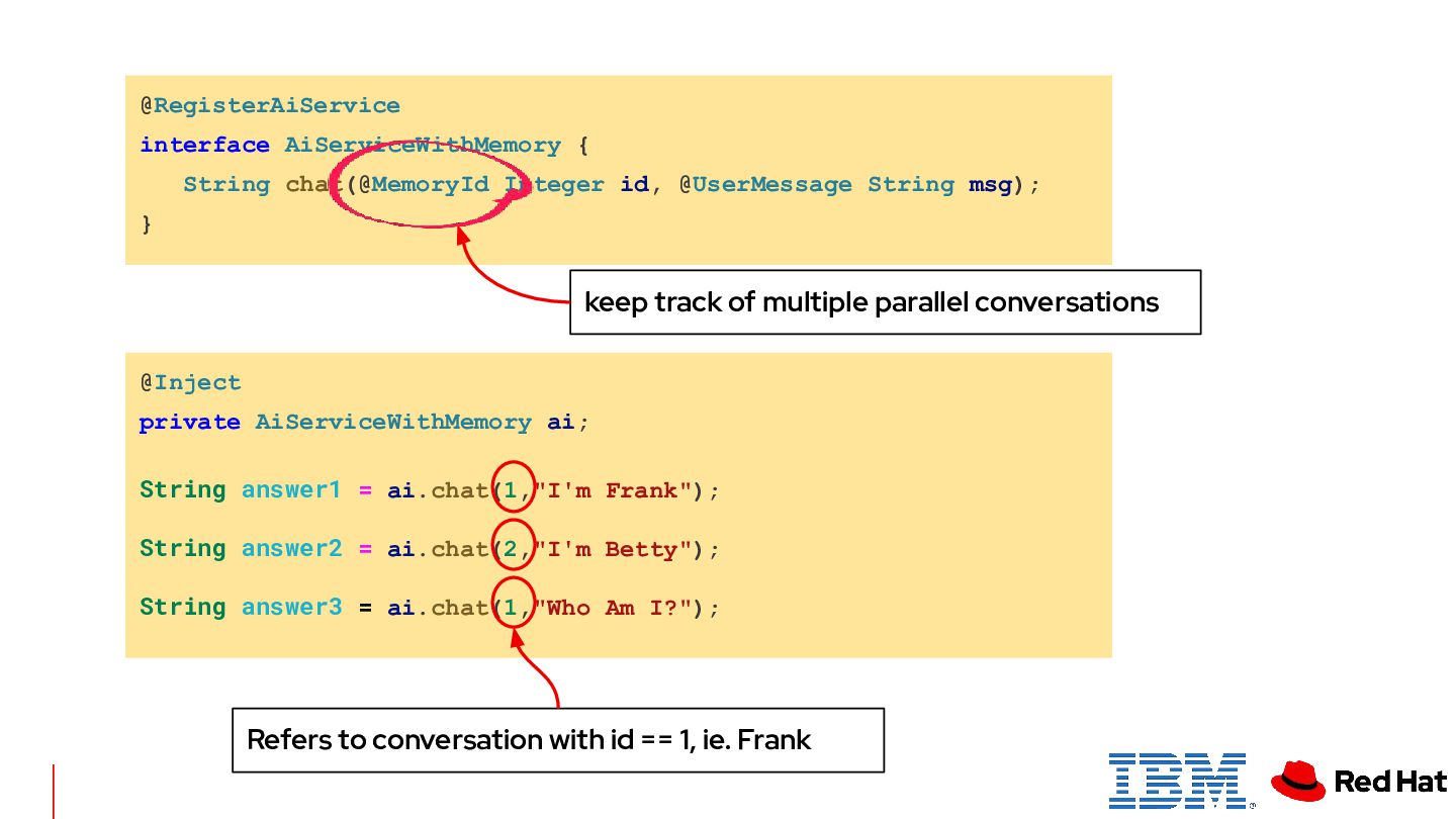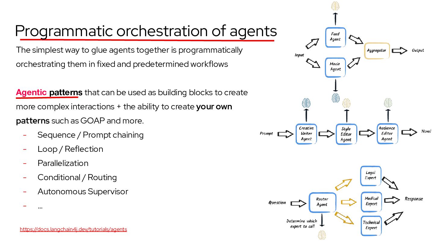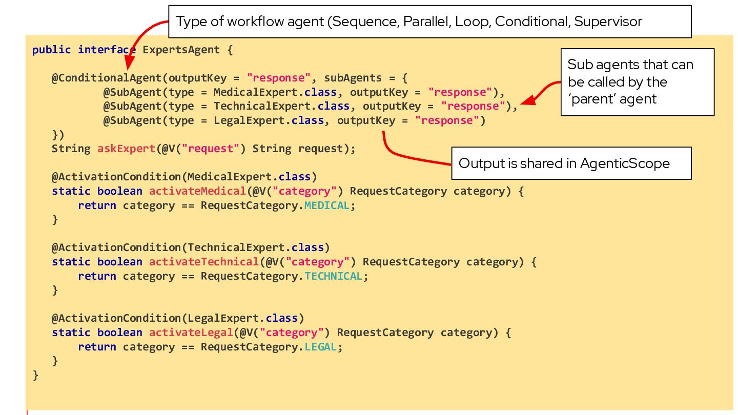 @SubAgent(type = MedicalExpert.class, outputKey = "response"), @SubAgent(type = TechnicalExpert.class, outputKey = "response"), @SubAgent(type = LegalExpert.class, outputKey = "response") }) String askExpert(@V("request") String request); @ActivationCondition(MedicalExpert.class) static boolean activateMedical(@V("category") RequestCategory category) { return category == RequestCategory.MEDICAL; } @ActivationCondition(TechnicalExpert.class) static boolean activateTechnical(@V("category") RequestCategory category) { return category == RequestCategory.TECHNICAL; } @ActivationCondition(LegalExpert.class) static boolean activateLegal(@V("category") RequestCategory category) { return category == RequestCategory.LEGAL; } } Type of workflow agent (Sequence, Parallel, Loop, Conditional, Supervisor Sub agents that can be called by the ‘parent’ agent Output is shared in AgenticScope