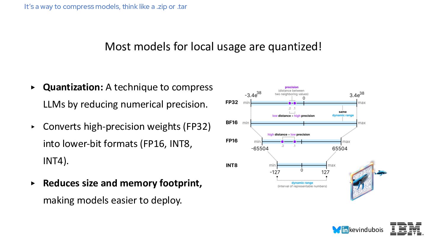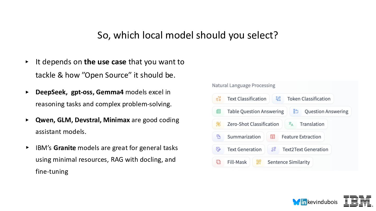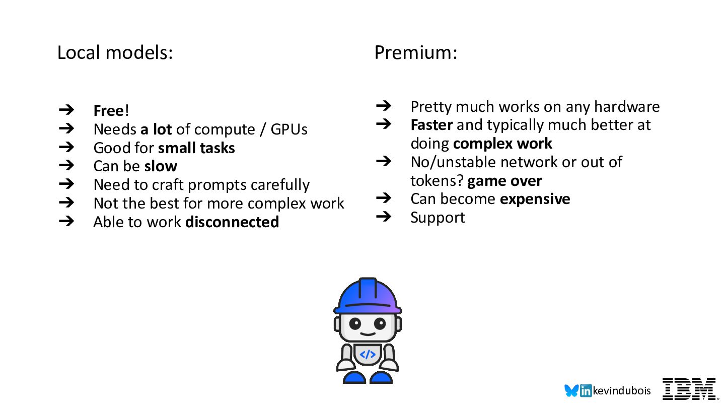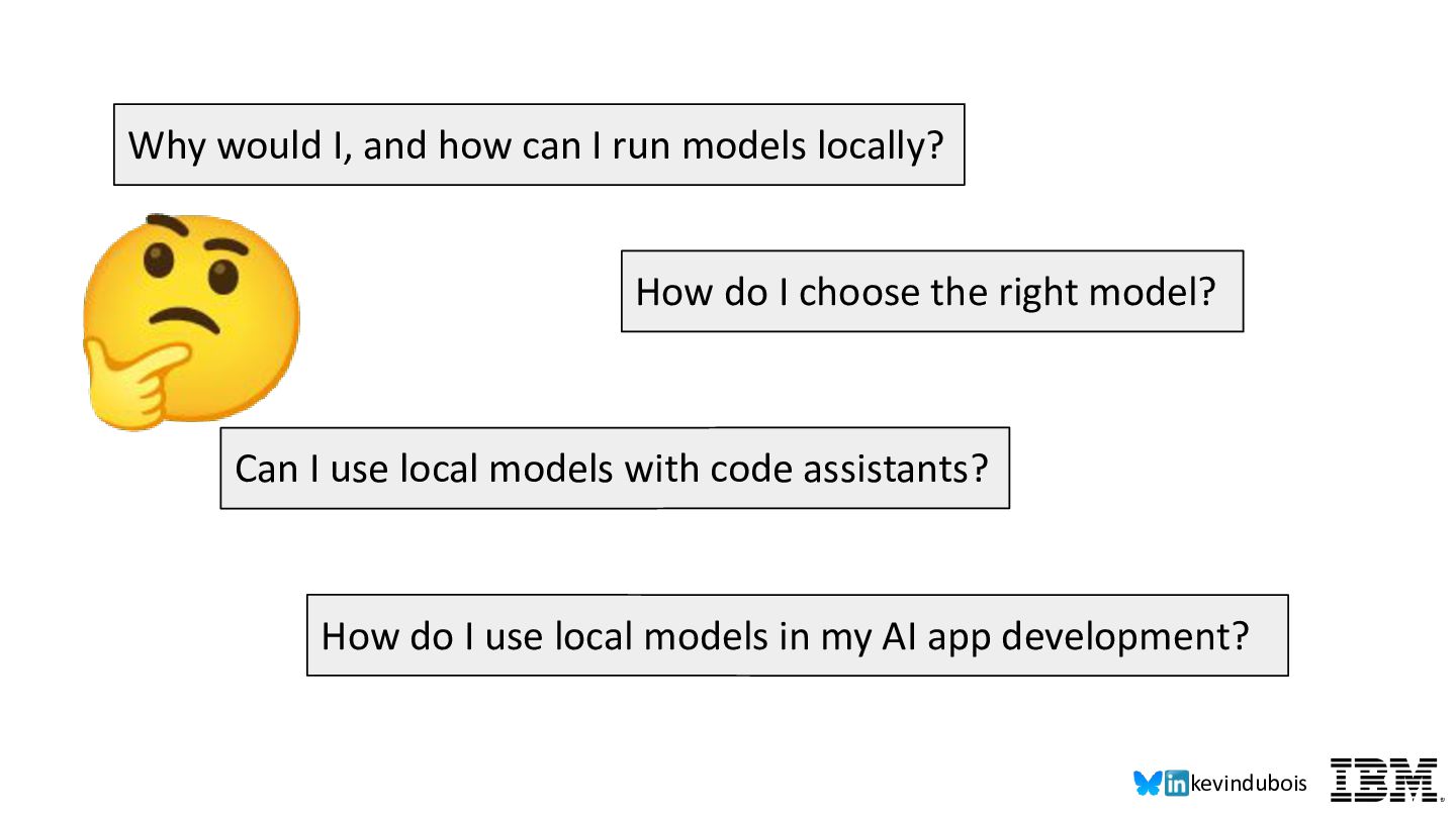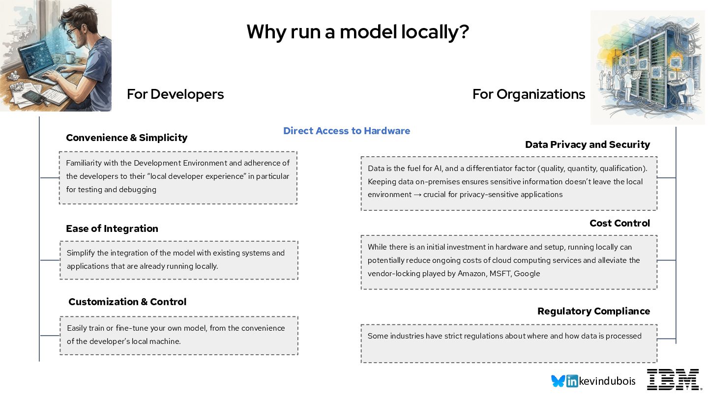 the Development Environment and adherence of the developers to their “local developer experience” in particular for testing and debugging Convenience & Simplicity Direct Access to Hardware Ease of Integration Simplify the integration of the model with existing systems and applications that are already running locally. For Organizations Data Privacy and Security Data is the fuel for AI, and a differentiator factor (quality, quantity, qualification). Keeping data on-premises ensures sensitive information doesn’t leave the local environment → crucial for privacy-sensitive applications Cost Control While there is an initial investment in hardware and setup, running locally can potentially reduce ongoing costs of cloud computing services and alleviate the vendor-locking played by Amazon, MSFT, Google Regulatory Compliance Some industries have strict regulations about where and how data is processed Customization & Control Easily train or fine-tune your own model, from the convenience of the developer’s local machine.