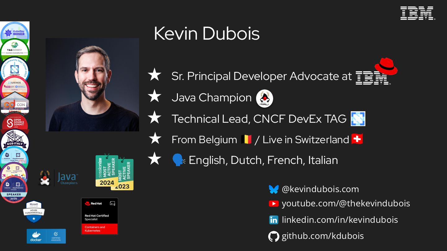 Champion ★ Technical Lead, CNCF DevEx TAG ★ From Belgium / Live in Switzerland ★ 🗣 English, Dutch, French, Italian youtube.com/@thekevindubois linkedin.com/in/kevindubois github.com/kdubois @kevindubois.com