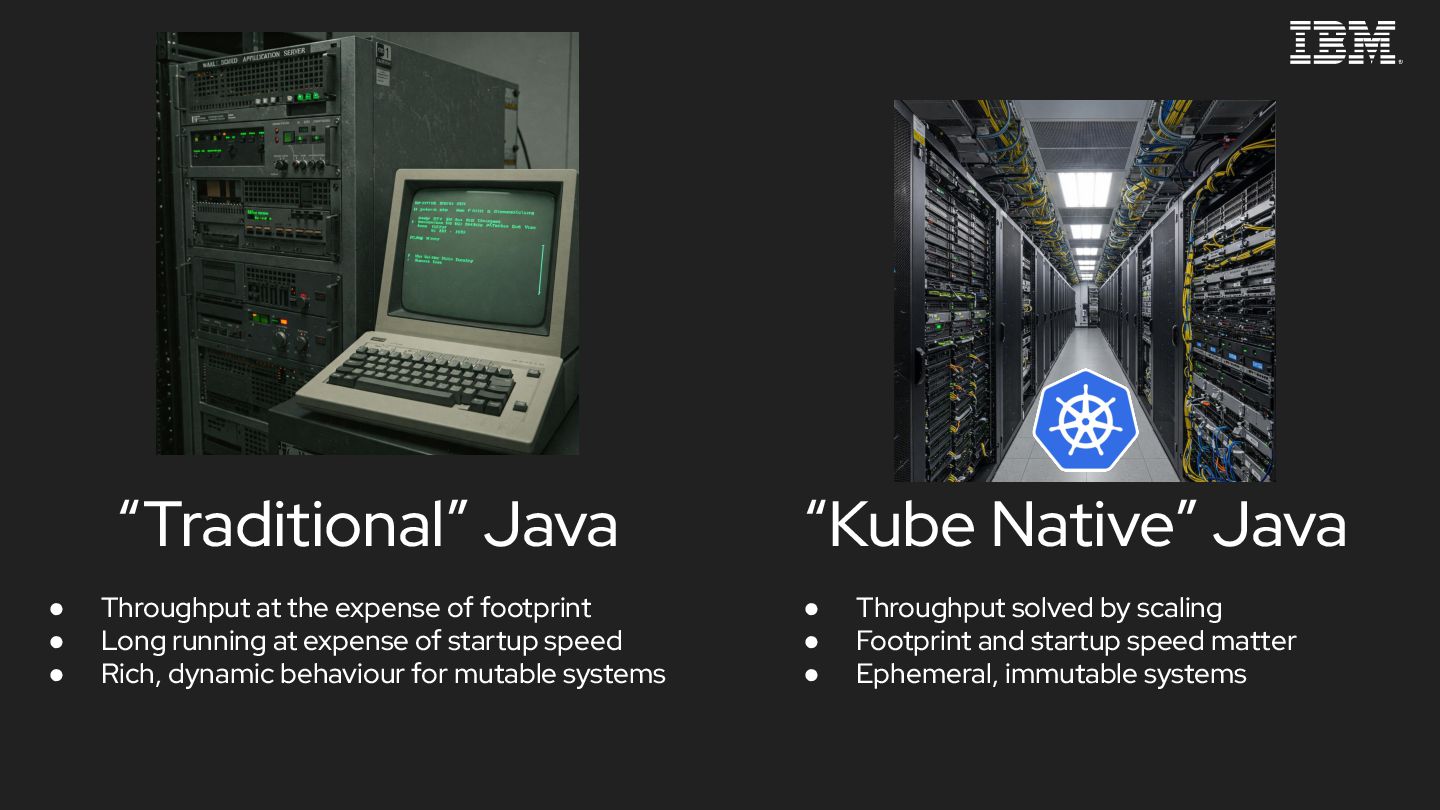 Long running at expense of startup speed • Rich, dynamic behaviour for mutable systems “Kube Native” Java • Throughput solved by scaling • Footprint and startup speed matter • Ephemeral, immutable systems