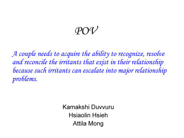 technology frequently) 20+ long-distance relationship It's hard to find the right time to talk about the problems. 30+ It is sometimes easier to settle conflicts through text messaging. long-term relationship, living together 20+ a new relationship When we only do things that he wants to do, I get mad at him and become really quiet, until he asks me what's wrong. 30+ Both dealing and not dealing with irritants are stressful.