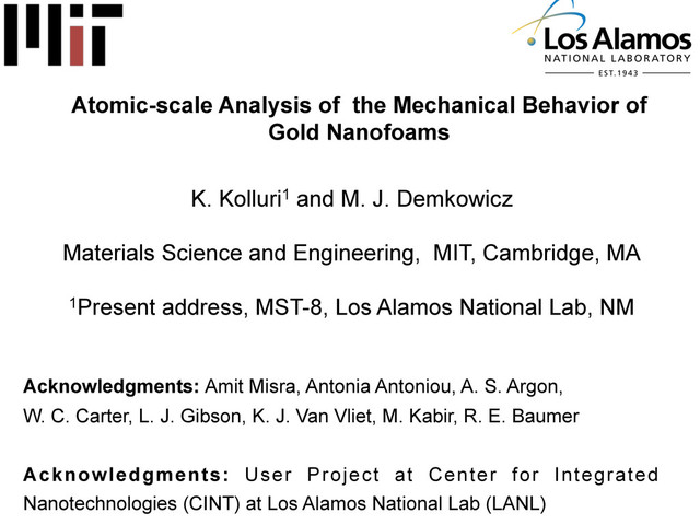et al., Adv. Mat., 9, 535, (2007) using the program MAVI. MAVI affords a rization of 3-D structures by analysis of their repre- ns as binary and spatially discrete images, using the ms described in reference [22]. Electron Microscopy entional TEM micrographs, such as the bright-field aphs of Figure 1, are 2-D projections which reveal ion about the average density along the beam direc- re, the micrographs illustrate the typical microstruc- nanoporous gold, which is composed of nanometer ments and pores. Energy dispersive analysis of X-ray ence of the sample volume shown in Figure 1(a) indi- t the average composition is Au96 Ag4 . Details of indi- old ligaments are shown in Figure 1(b). ected area electron diffraction (SAED) pattern (the corresponds to a circular area of about 800 nm in ) from the same volume as shown in Figure 1(a) (see veals a preferred <100> out-of-plane orientation, con- (b) connected network structure composed of single-crystalline gold ligaments nsity of gold ligaments due to the overlap in the 2-D projection. The corre- t indicates a preferred <100> out-of-plane orientation with considerable Single crystal nanoporous gold J. Erlebacher et al., Nature, 410, 450, (2001) FIG. 1. SEM micrograph obtained from (a) synthesized Au porous samples and (b) dark-field and bright-field TEM micro showing four distinct grains <50 nm. The corresponding selected area diffraction pattern is shown in the inset. J. Mater. Res., Vol. 20, No. 3, Mar 2005 Polycrstalline crystal nanoporous gold A. M. Hodge et al., J. Mater. Res., 20, 3, (2005) • Dealloyed nanofoams come in a wide variety • They are all open cell with ligaments and pores • Their formation, coarsening, and deformation mechanisms are of interest