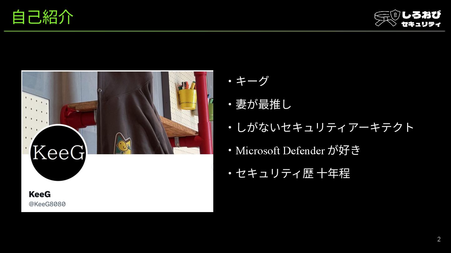 ⾃⼰紹介 ‧キーグ ‧妻が最推し ‧しがないセキュリティアーキテクト ‧Microsoft Defender が好き ‧セキュリティ歴 ⼗年程 2