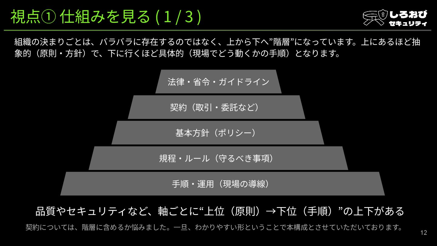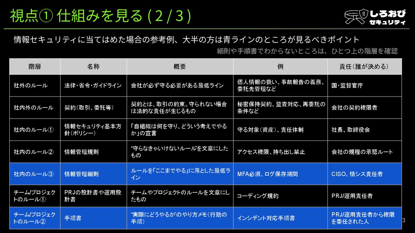 名称 概要 例 責任(誰が決める) 社外のルール 法律・省令・ガイドライン 会社が必ず守る必要がある最低ライン 個人情報の扱い、事故報告の義務、 委託先管理など 国・監督官庁 社内外のルール 契約(取引、委託等) 契約とは、取引の約束。守られない場合 は法的な責任が生じるもの 秘密保持契約、監査対応、再委託の 条件など 会社の契約権限者 社内のルール① 情報セキュリティ基本方 針(ポリシー) 「自組織は何を守り、どういう考えでやる か」の宣言 守る対象(資産)、責任体制 社長、取締役会 社内のルール② 情報管理規則 “守らなきゃいけないルール ”を文章にした もの アクセス権限、持ち出し禁止 会社の規程の承認ルート 社内のルール③ 情報管理細則 ルールを「ここまでやる」に落とした最低ラ イン MFA必須、ログ保存期間 CISO、情シス責任者 チーム/プロジェク トのルール① PRJの設計書や運用設 計書 チームやプロジェクトのルールを文章にし たもの コーディング規約 PRJ/運用責任者 チーム/プロジェク トのルール② 手順書 “実際にどうやるか”のやり方メモ(行動の 手順) インシデント対応手順書 PRJ/運用責任者から権限 を委任された人 細則や⼿順書でわからないところは、ひとつ上の階層を確認