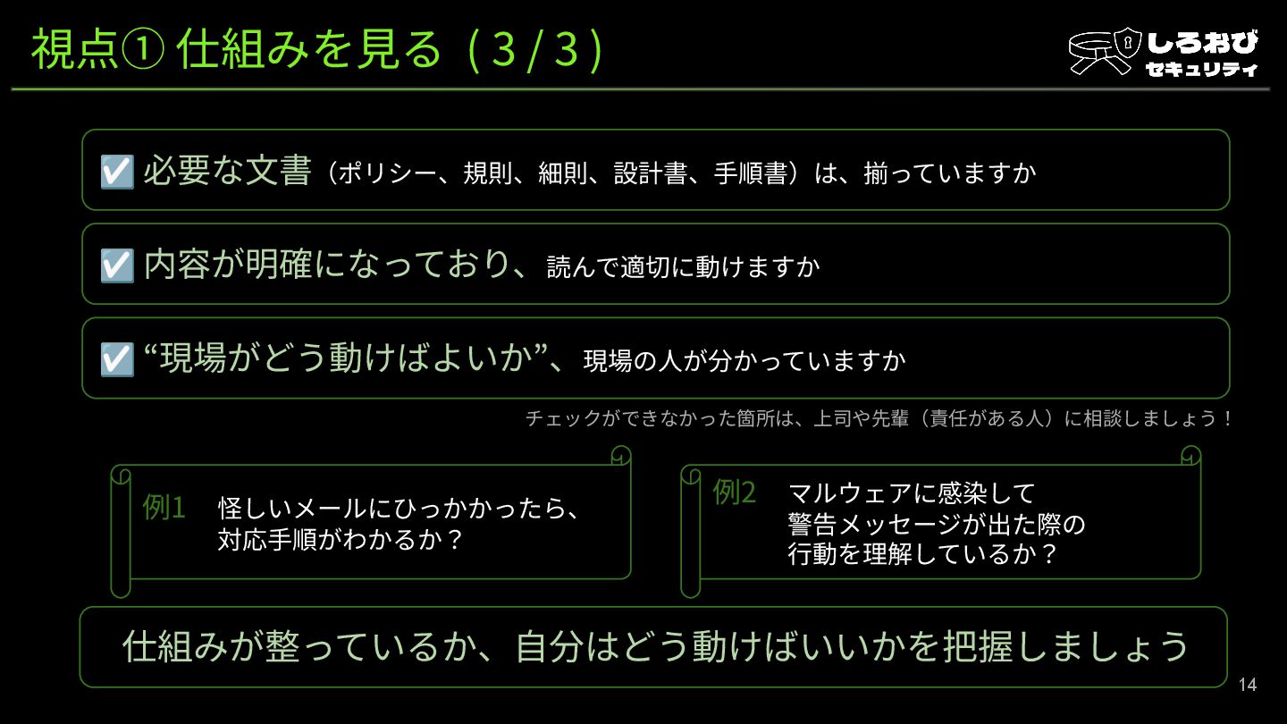 ☑ 内容が明確になっており、読んで適切に動けますか ☑ “現場がどう動けばよいか”、現場の⼈が分かっていますか 仕組みが整っているか、⾃分はどう動けばいいかを把握しましょう 例1 怪しいメールにひっかかったら、 対応⼿順がわかるか? 例2 マルウェアに感染して 警告メッセージが出た際の ⾏動を理解しているか? チェックができなかった箇所は、上司や先輩(責任がある⼈)に相談しましょう!