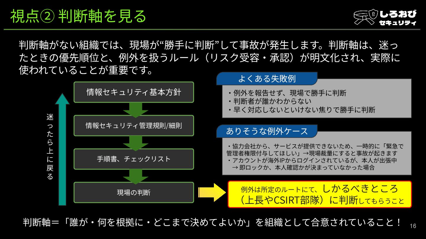 判断軸=「誰が‧何を根拠に‧どこまで決めてよいか」を組織として合意されていること! 迷 っ た ら 上 に 戻 る 例外は所定のルートにて、しかるべきところ (上⻑やCSIRT部隊)に判断してもらうこと ‧例外を報告せず、現場で勝⼿に判断 ‧判断者が誰かわからない ‧早く対応しないといけない焦りで勝⼿に判断 よくある失敗例 ‧協⼒会社から、サービスが提供できないため、⼀時的に「緊急で 管理者権限付与してほしい」→現場裁量にすると事故が起きます ‧アカウントが海外IPからログインされているが、本⼈が出張中 → 即ロックか、本⼈確認かが決まっていなかった場合 ありそうな例外ケース