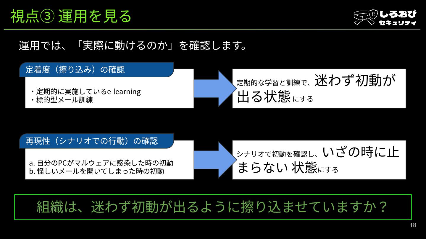 定期的な学習と訓練で、 迷わず初動が 出る状態 にする 視点③ 運⽤を⾒る 運⽤では、「実際に動けるのか」を確認します。 18 ‧定期的に実施しているe-learning ‧標的型メール訓練