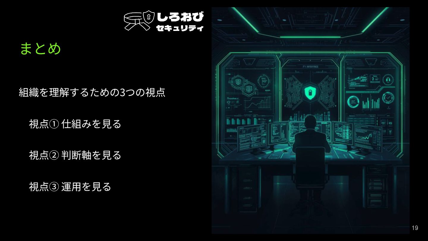 まとめ 組織を理解するための3つの視点 視点① 仕組みを⾒る 視点② 判断軸を⾒る 視点③ 運⽤を⾒る 19