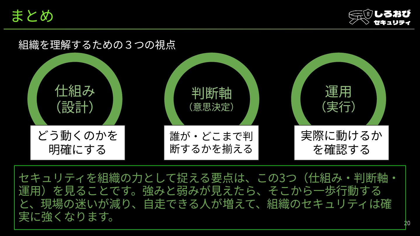 明確にする 誰が‧どこまで判 断するかを揃える 実際に動けるか を確認する セキュリティを組織の⼒として捉える要点は、この3つ(仕組み‧判断軸‧ 運⽤)を⾒ることです。強みと弱みが⾒えたら、そこから⼀歩⾏動する と、現場の迷いが減り、⾃⾛できる⼈が増えて、組織のセキュリティは確 実に強くなります。