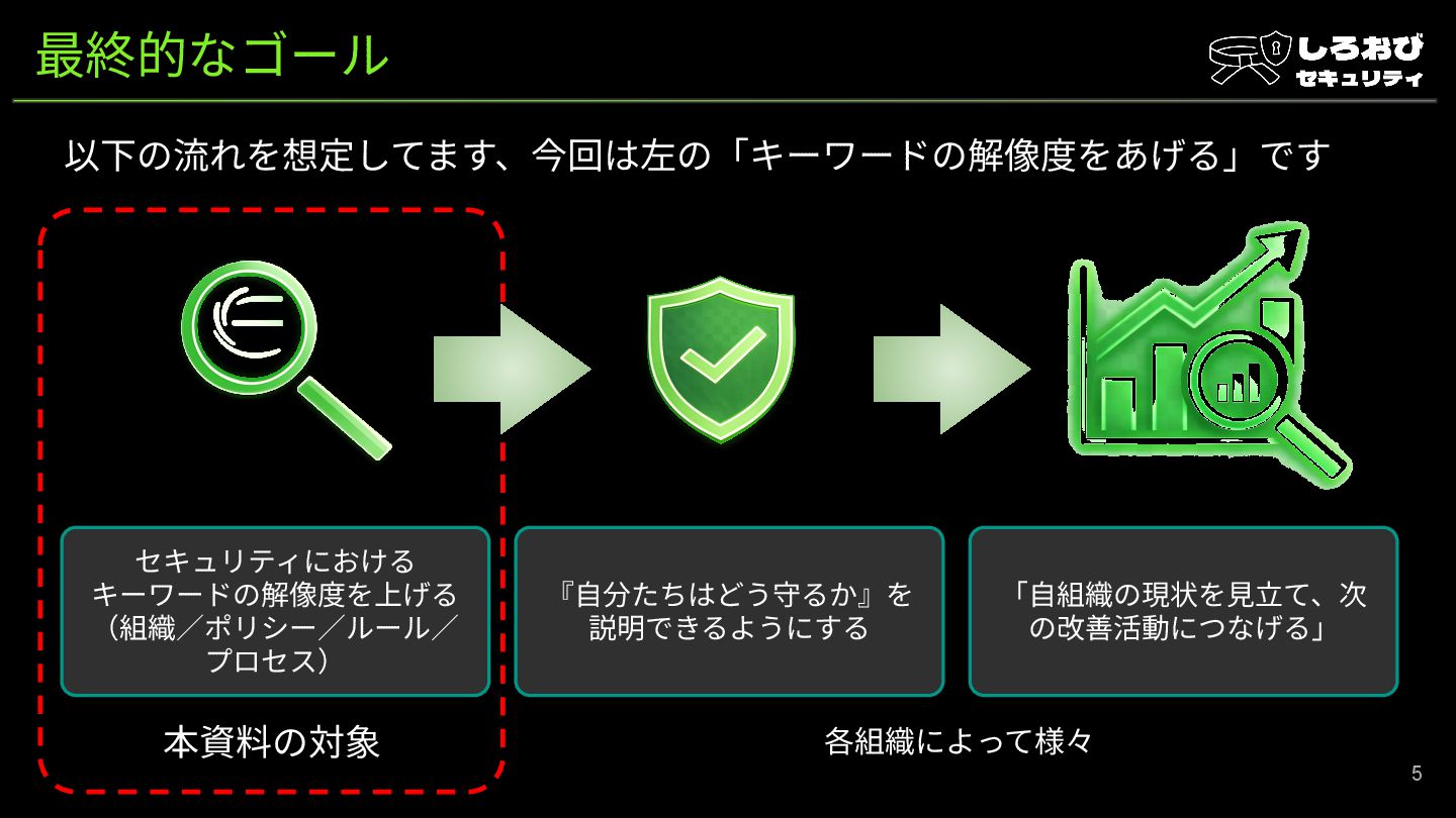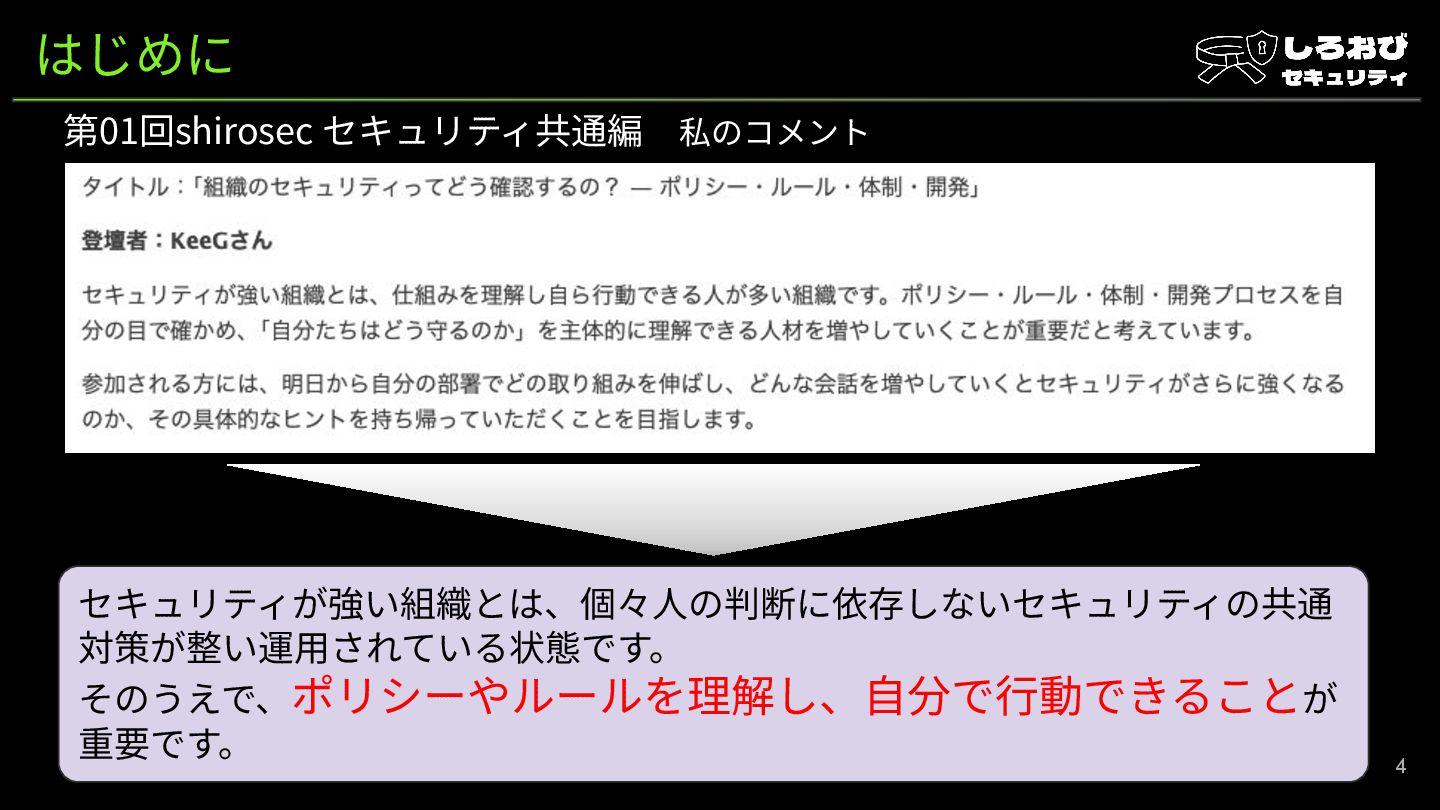 はじめに 第01回shirosec セキュリティ共通編 私のコメント 4 セキュリティが強い組織とは、個々⼈の判断に依存しないセキュリティの共通 対策が整い運⽤されている状態です。 そのうえで、ポリシーやルールを理解し、⾃分で⾏動できることが 重要です。