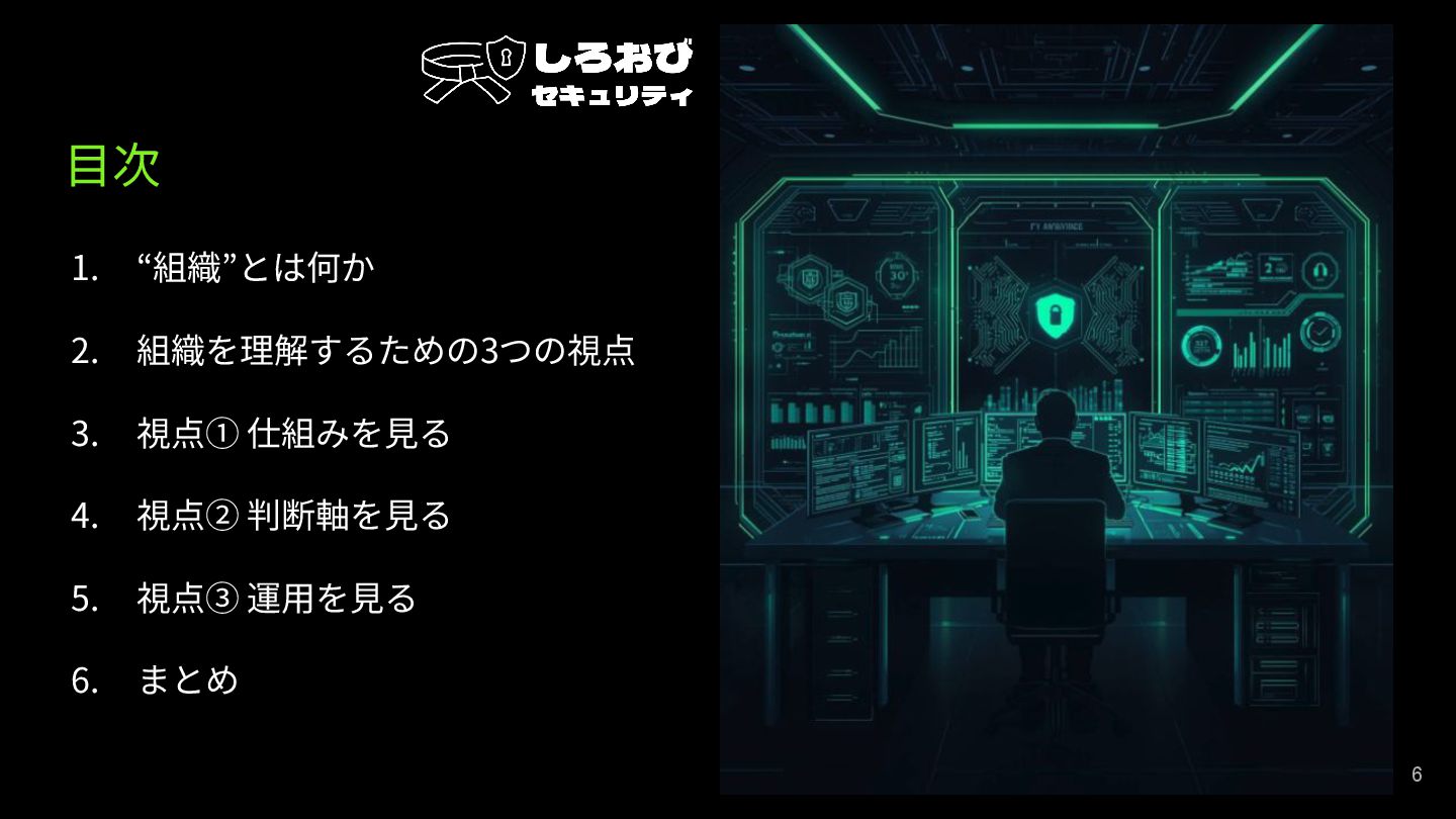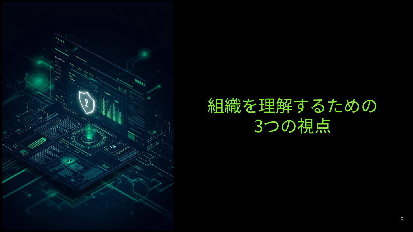 ⽬次 1. “組織”とは何か 2. 組織を理解するための3つの視点 3. 視点① 仕組みを⾒る 4. 視点②