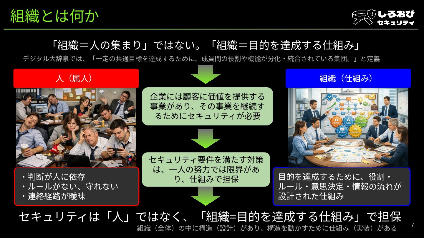 デジタル⼤辞泉では、「⼀定の共通⽬標を達成するために、成員間の役割や機能が分化‧統合されている集団。」と定義 ⼈(属⼈) 組織(仕組み) 企業には顧客に価値を提供する 事業があり、その事業を継続す るためにセキュリティが必要 セキュリティ要件を満たす対策 は、⼀⼈の努⼒では限界があ り、仕組みで担保 組織(全体)の中に構造(設計)があり、構造を動かすために仕組み(実装)がある
