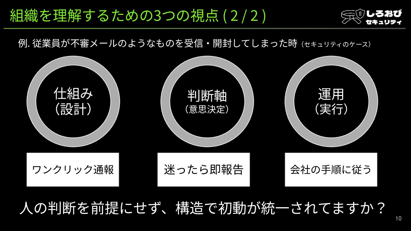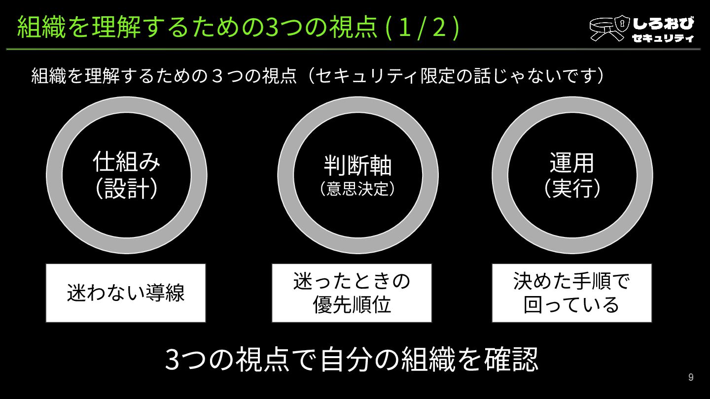 組織を理解するための3つの視点 ( 1 / 2 ) 組織を理解するための3つの視点(セキュリティ限定の話じゃないです) 9 仕組み (設計)