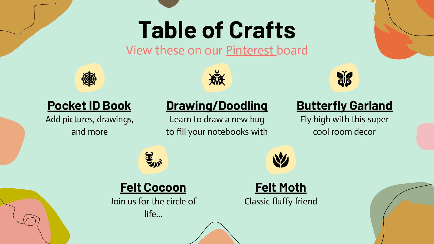bug to fill your notebooks with Fly high with this super cool room decor Join us for the circle of life… Classic fluffy friend Pocket ID Book Drawing/Doodling Butterfly Garland Felt Cocoon Felt Moth Table of Crafts View these on our Pinterest board