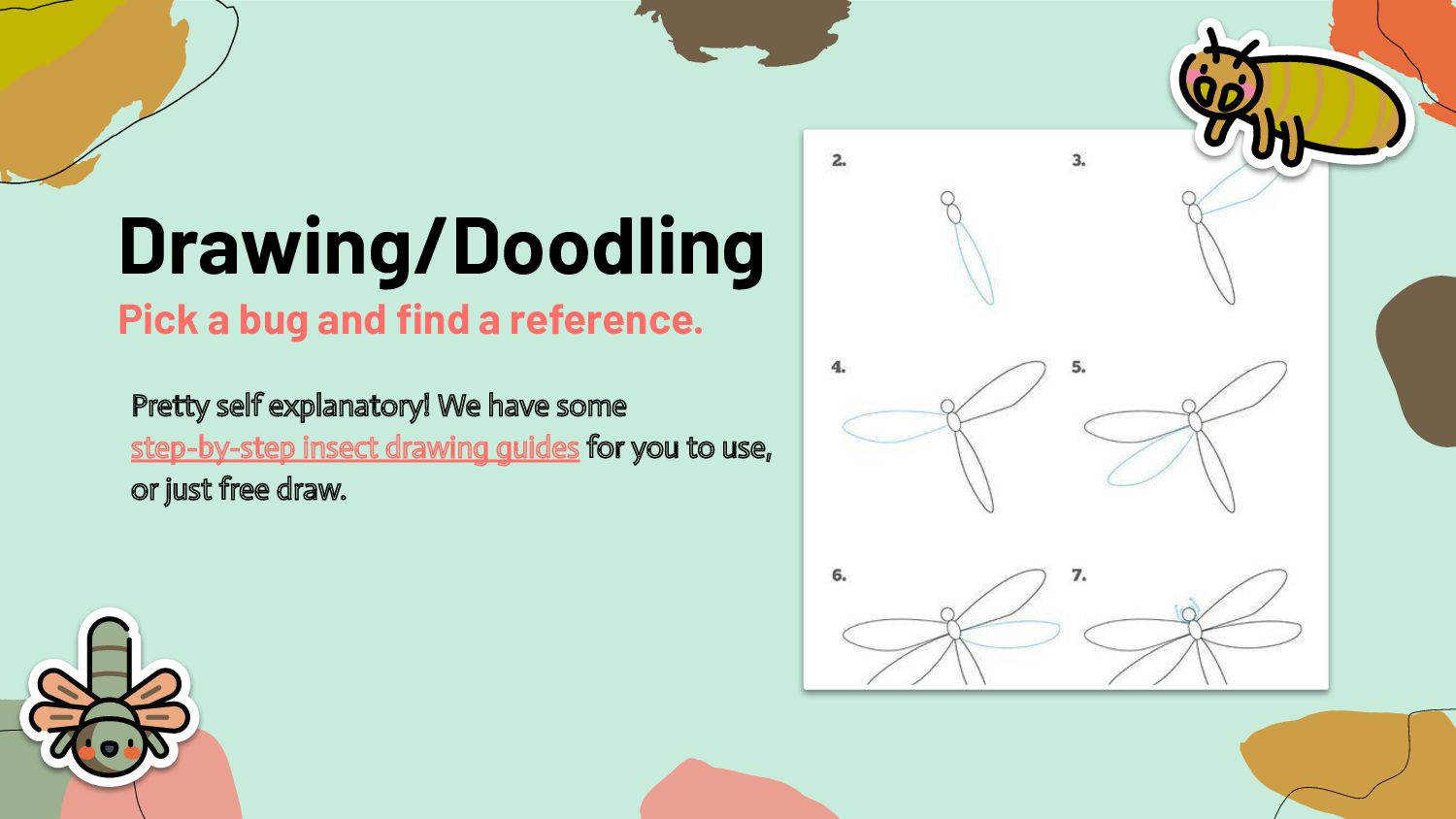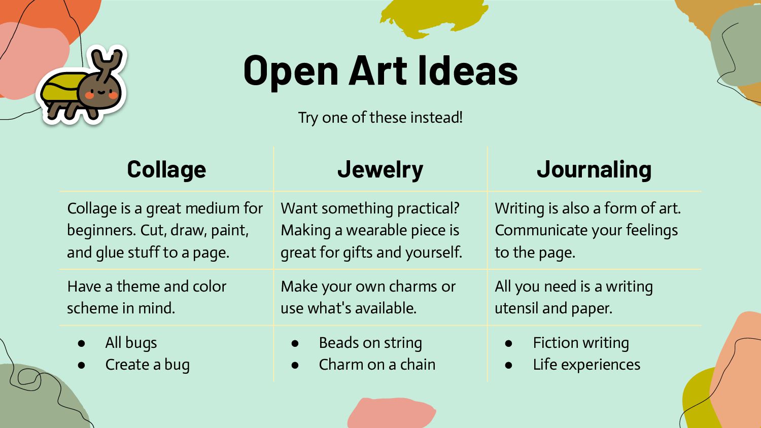 medium for beginners. Cut, draw, paint, and glue stuff to a page. Want something practical? Making a wearable piece is great for gifts and yourself. Writing is also a form of art. Communicate your feelings to the page. Have a theme and color scheme in mind. Make your own charms or use what's available. All you need is a writing utensil and paper. • All bugs • Create a bug • Beads on string • Charm on a chain • Fiction writing • Life experiences Try one of these instead!