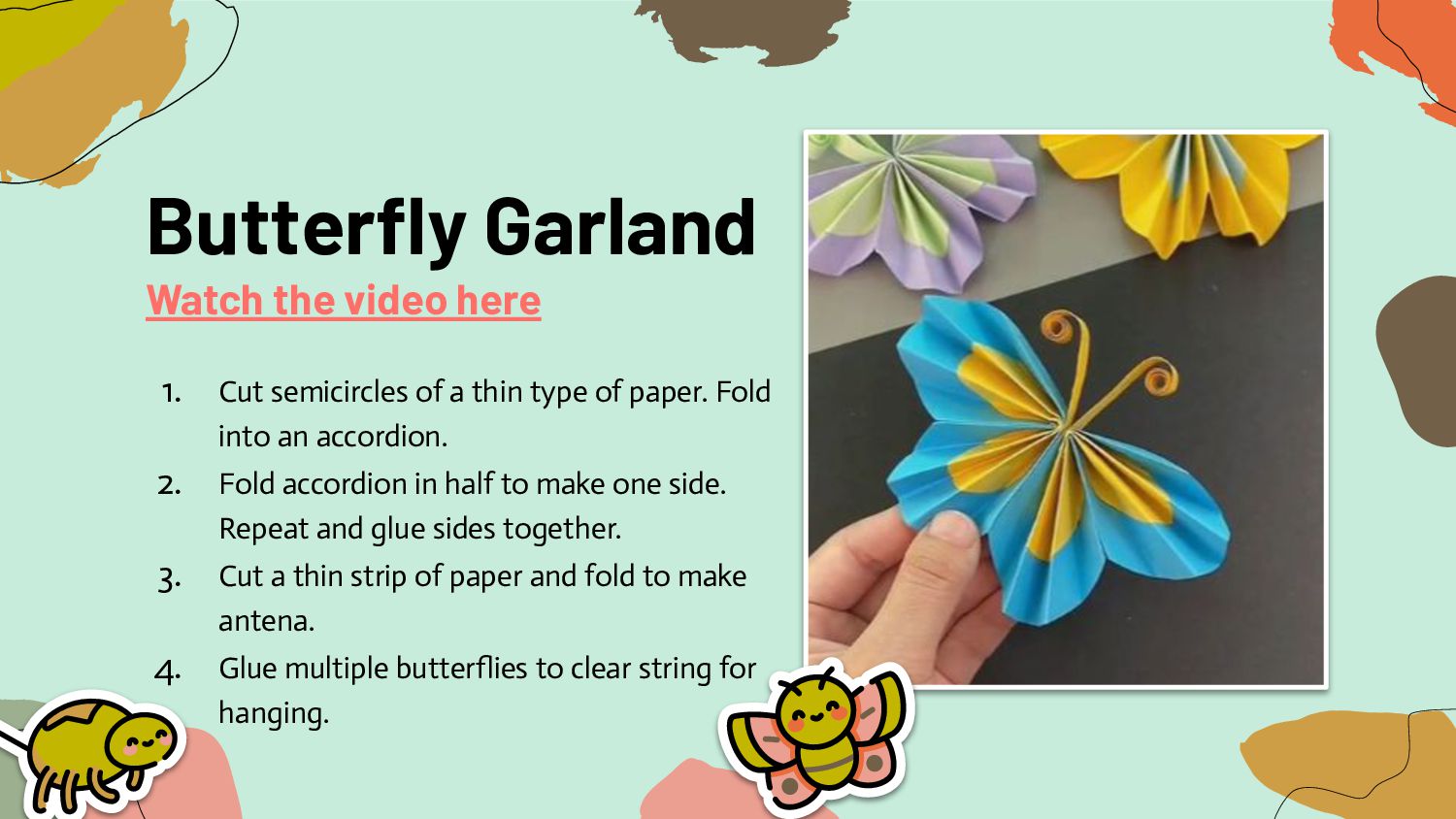 a thin type of paper. Fold into an accordion. 2. Fold accordion in half to make one side. Repeat and glue sides together. 3. Cut a thin strip of paper and fold to make antena. 4. Glue multiple butterflies to clear string for hanging.