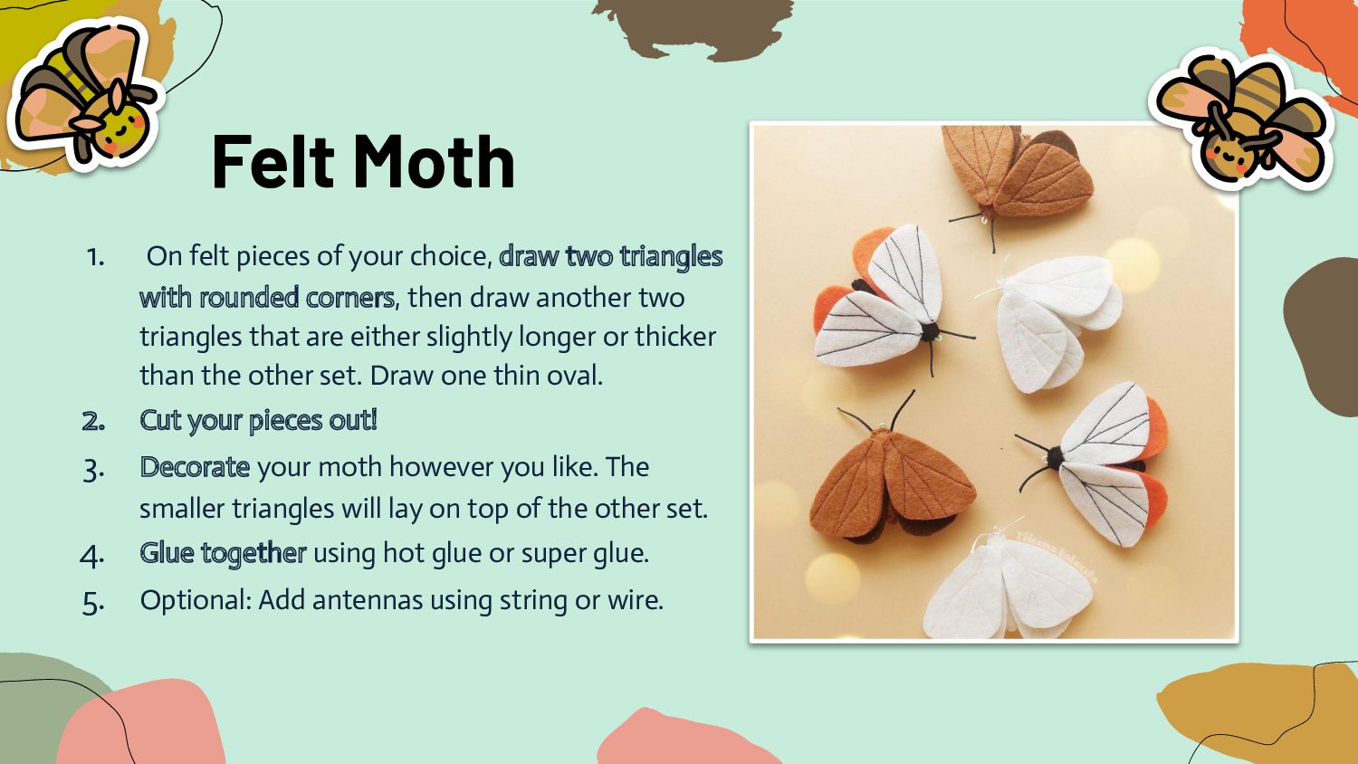 two triangles with rounded corners, then draw another two triangles that are either slightly longer or thicker than the other set. Draw one thin oval. 2. Cut your pieces out! 3. Decorate your moth however you like. The smaller triangles will lay on top of the other set. 4. Glue together using hot glue or super glue. 5. Optional: Add antennas using string or wire.