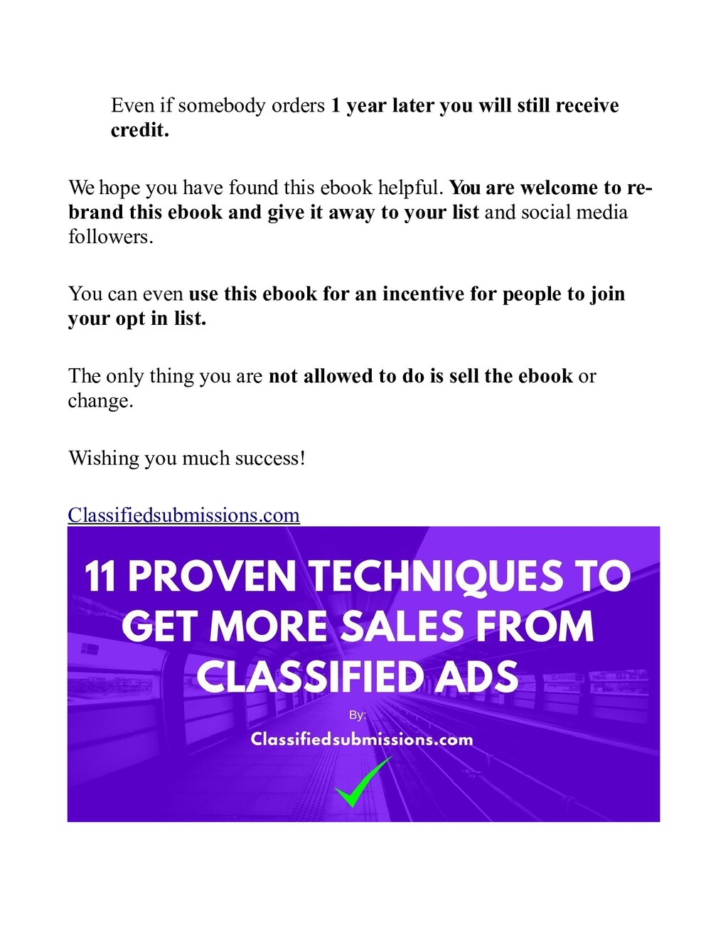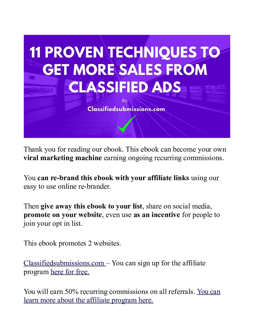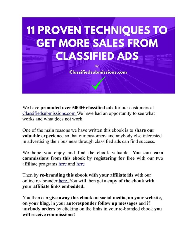 at Classifiedsubmissions.com We have had an opportunity to see what works and what does not work. One of the main reasons we have written this ebook is to share our valuable experience so that our customers and anybody else interested in advertising their business through classified ads can find success. We hope you enjoy and find the ebook valuable. You can earn commissions from this ebook by registering for free with our two affiliate programs here and here Then by re-branding this ebook with your affiliate ids with our online re- brander here. You will then get a copy of the ebook with your affiliate links embedded. You then can give away this ebook on social media, on your website, on your blog, in your autoresponder follow up messages and if anybody orders by clicking on the links in your re-branded ebook you will receive commissions!
