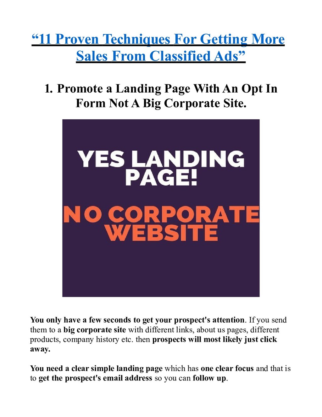 1. Promote a Landing Page With An Opt In Form Not A Big Corporate Site. You only have a few seconds to get your prospect's attention. If you send them to a big corporate site with different links, about us pages, different products, company history etc. then prospects will most likely just click away. You need a clear simple landing page which has one clear focus and that is to get the prospect's email address so you can follow up.