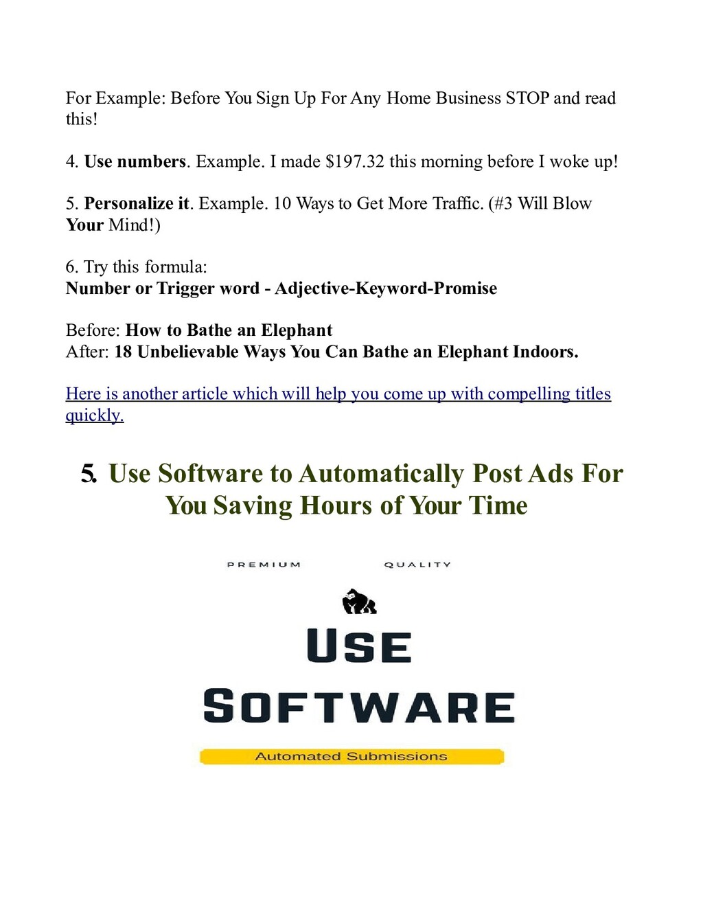 STOP and read this! 4. Use numbers. Example. I made $197.32 this morning before I woke up! 5. Personalize it. Example. 10 Ways to Get More Traffic. (#3 Will Blow Your Mind!) 6. Try this formula: Number or Trigger word - Adjective-Keyword-Promise Before: How to Bathe an Elephant After: 18 Unbelievable Ways You Can Bathe an Elephant Indoors. Here is another article which will help you come up with compelling titles quickly. 5. Use Software to Automatically Post Ads For You Saving Hours of Your Time