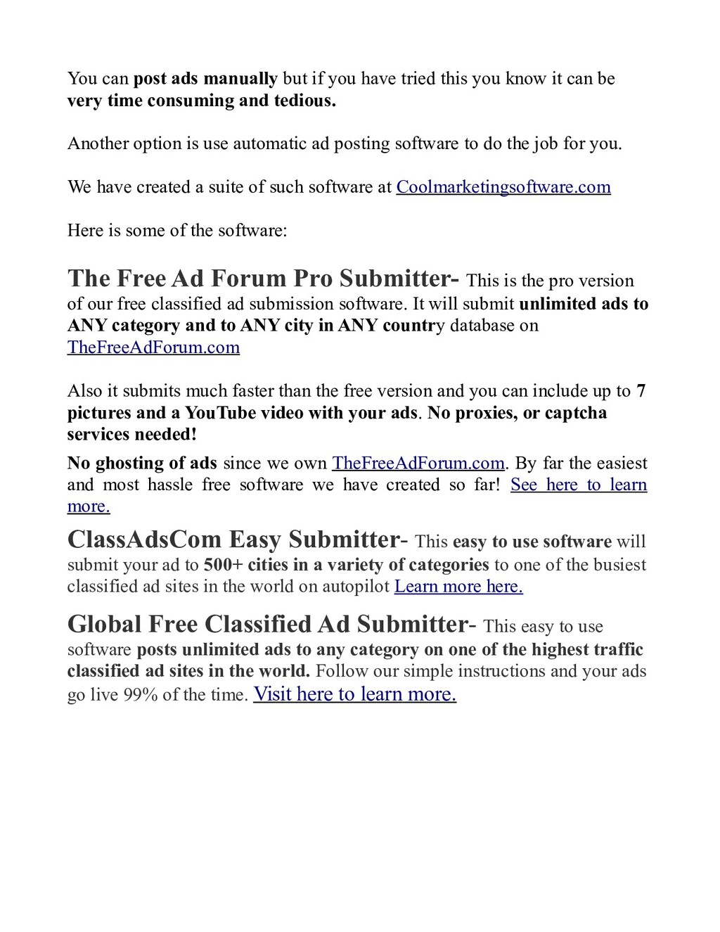 this you know it can be very time consuming and tedious. Another option is use automatic ad posting software to do the job for you. We have created a suite of such software at Coolmarketingsoftware.com Here is some of the software: The Free Ad Forum Pro Submitter- This is the pro version of our free classified ad submission software. It will submit unlimited ads to ANY category and to ANY city in ANY country database on TheFreeAdForum.com Also it submits much faster than the free version and you can include up to 7 pictures and a YouTube video with your ads. No proxies, or captcha services needed! No ghosting of ads since we own TheFreeAdForum.com. By far the easiest and most hassle free software we have created so far! See here to learn more. ClassAdsCom Easy Submitter- This easy to use software will submit your ad to 500+ cities in a variety of categories to one of the busiest classified ad sites in the world on autopilot Learn more here. Global Free Classified Ad Submitter- This easy to use software posts unlimited ads to any category on one of the highest traffic classified ad sites in the world. Follow our simple instructions and your ads go live 99% of the time. Visit here to learn more.