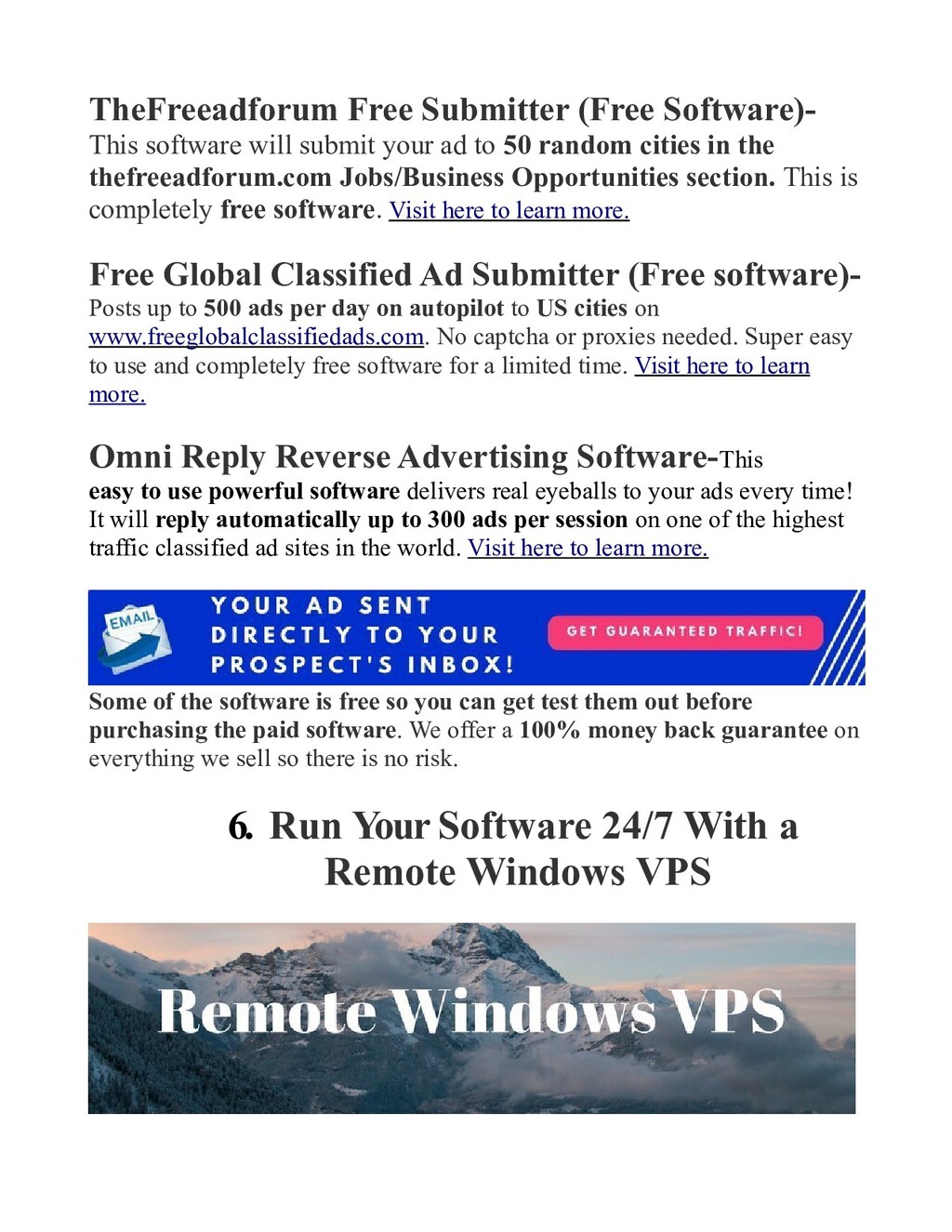 ad to 50 random cities in the thefreeadforum.com Jobs/Business Opportunities section. This is completely free software. Visit here to learn more. Free Global Classified Ad Submitter (Free software)- Posts up to 500 ads per day on autopilot to US cities on www.freeglobalclassifiedads.com. No captcha or proxies needed. Super easy to use and completely free software for a limited time. Visit here to learn more. Omni Reply Reverse Advertising Software-This easy to use powerful software delivers real eyeballs to your ads every time! It will reply automatically up to 300 ads per session on one of the highest traffic classified ad sites in the world. Visit here to learn more. Some of the software is free so you can get test them out before purchasing the paid software. We offer a 100% money back guarantee on everything we sell so there is no risk. 6. Run Your Software 24/7 With a Remote Windows VPS