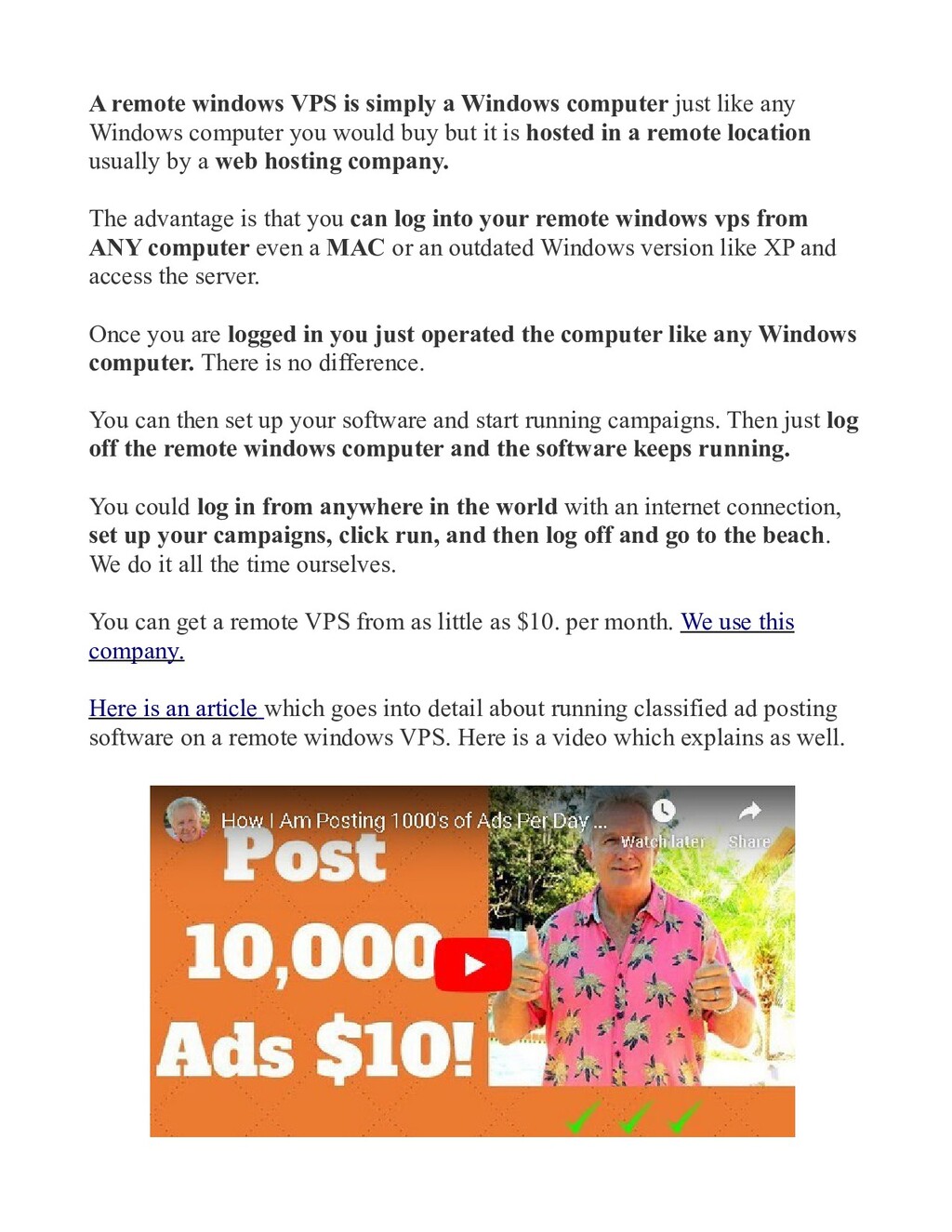 like any Windows computer you would buy but it is hosted in a remote location usually by a web hosting company. The advantage is that you can log into your remote windows vps from ANY computer even a MAC or an outdated Windows version like XP and access the server. Once you are logged in you just operated the computer like any Windows computer. There is no difference. You can then set up your software and start running campaigns. Then just log off the remote windows computer and the software keeps running. You could log in from anywhere in the world with an internet connection, set up your campaigns, click run, and then log off and go to the beach. We do it all the time ourselves. You can get a remote VPS from as little as $10. per month. We use this company. Here is an article which goes into detail about running classified ad posting software on a remote windows VPS. Here is a video which explains as well.