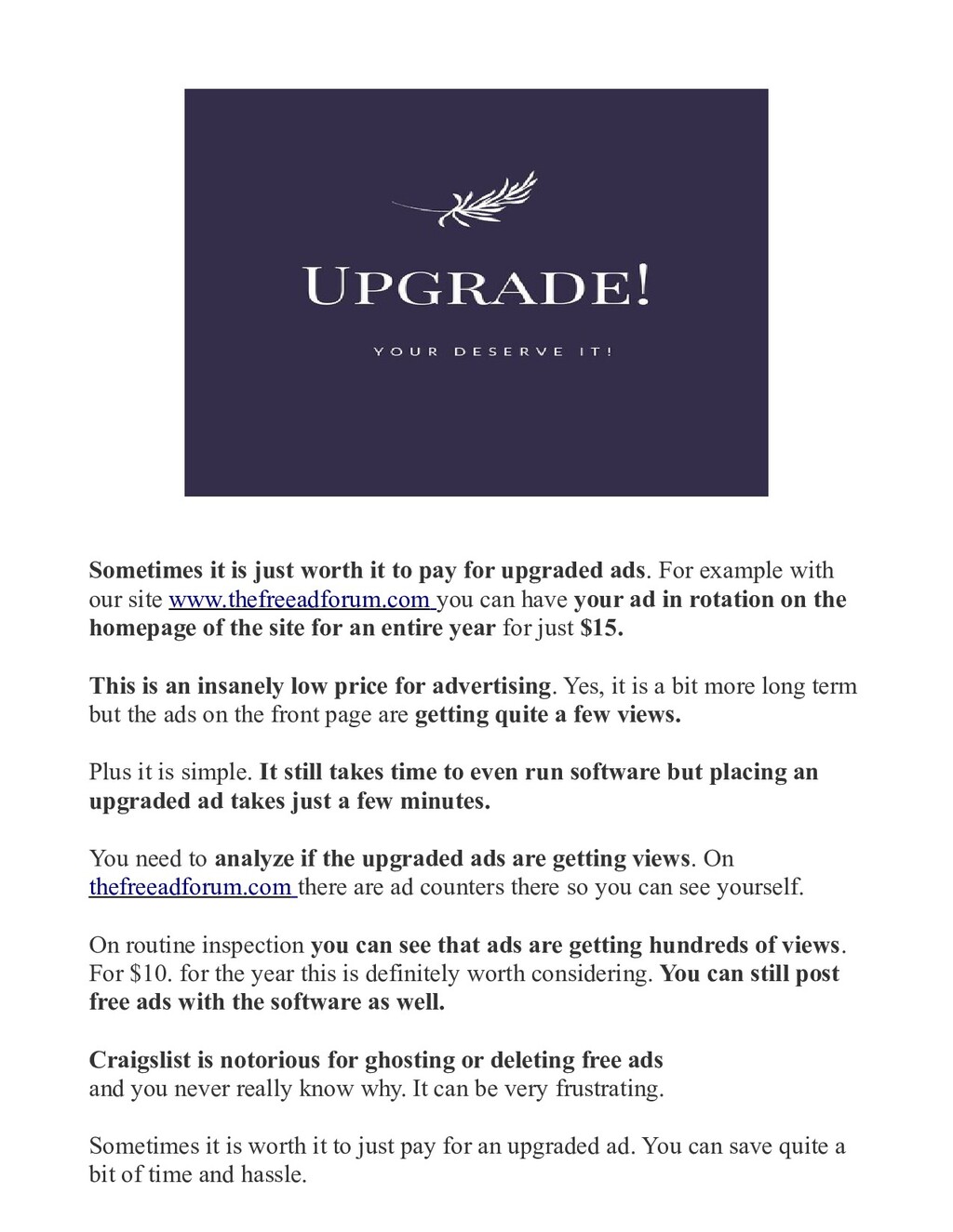ads. For example with our site www.thefreeadforum.com you can have your ad in rotation on the homepage of the site for an entire year for just $15. This is an insanely low price for advertising. Yes, it is a bit more long term but the ads on the front page are getting quite a few views. Plus it is simple. It still takes time to even run software but placing an upgraded ad takes just a few minutes. You need to analyze if the upgraded ads are getting views. On thefreeadforum.com there are ad counters there so you can see yourself. On routine inspection you can see that ads are getting hundreds of views. For $10. for the year this is definitely worth considering. You can still post free ads with the software as well. Craigslist is notorious for ghosting or deleting free ads and you never really know why. It can be very frustrating. Sometimes it is worth it to just pay for an upgraded ad. You can save quite a bit of time and hassle.