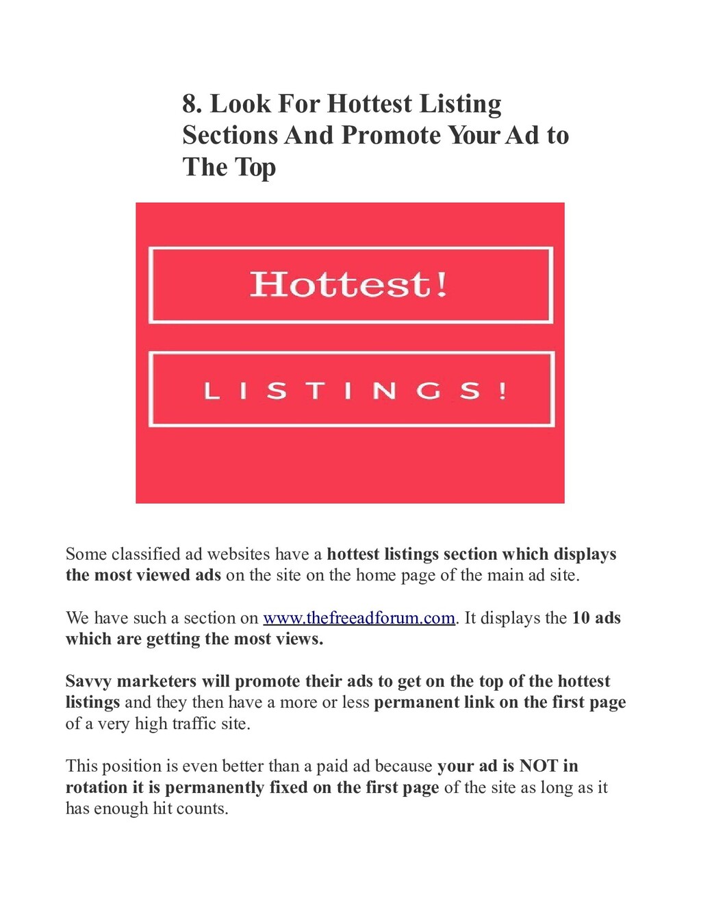 to The Top Some classified ad websites have a hottest listings section which displays the most viewed ads on the site on the home page of the main ad site. We have such a section on www.thefreeadforum.com. It displays the 10 ads which are getting the most views. Savvy marketers will promote their ads to get on the top of the hottest listings and they then have a more or less permanent link on the first page of a very high traffic site. This position is even better than a paid ad because your ad is NOT in rotation it is permanently fixed on the first page of the site as long as it has enough hit counts.