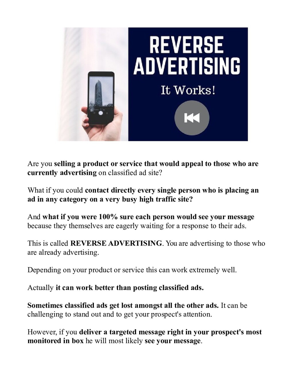 to those who are currently advertising on classified ad site? What if you could contact directly every single person who is placing an ad in any category on a very busy high traffic site? And what if you were 100% sure each person would see your message because they themselves are eagerly waiting for a response to their ads. This is called REVERSE ADVERTISING. You are advertising to those who are already advertising. Depending on your product or service this can work extremely well. Actually it can work better than posting classified ads. Sometimes classified ads get lost amongst all the other ads. It can be challenging to stand out and to get your prospect's attention. However, if you deliver a targeted message right in your prospect's most monitored in box he will most likely see your message.