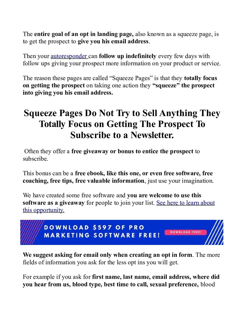 known as a squeeze page, is to get the prospect to give you his email address. Then your autoresponder can follow up indefinitely every few days with follow ups giving your prospect more information on your product or service. The reason these pages are called “Squeeze Pages” is that they totally focus on getting the prospect on taking one action they “squeeze” the prospect into giving you his email address. Squeeze Pages Do Not Try to Sell Anything They Totally Focus on Getting The Prospect To Subscribe to a Newsletter. Often they offer a free giveaway or bonus to entice the prospect to subscribe. This bonus can be a free ebook, like this one, or even free software, free coaching, free tips, free valuable information, just use your imagination. We have created some free software and you are welcome to use this software as a giveaway for people to join your list. See here to learn about this opportunity. We suggest asking for email only when creating an opt in form. The more fields of information you ask for the less opt ins you will get. For example if you ask for first name, last name, email address, where did you hear from us, blood type, best time to call, sexual preference, blood
