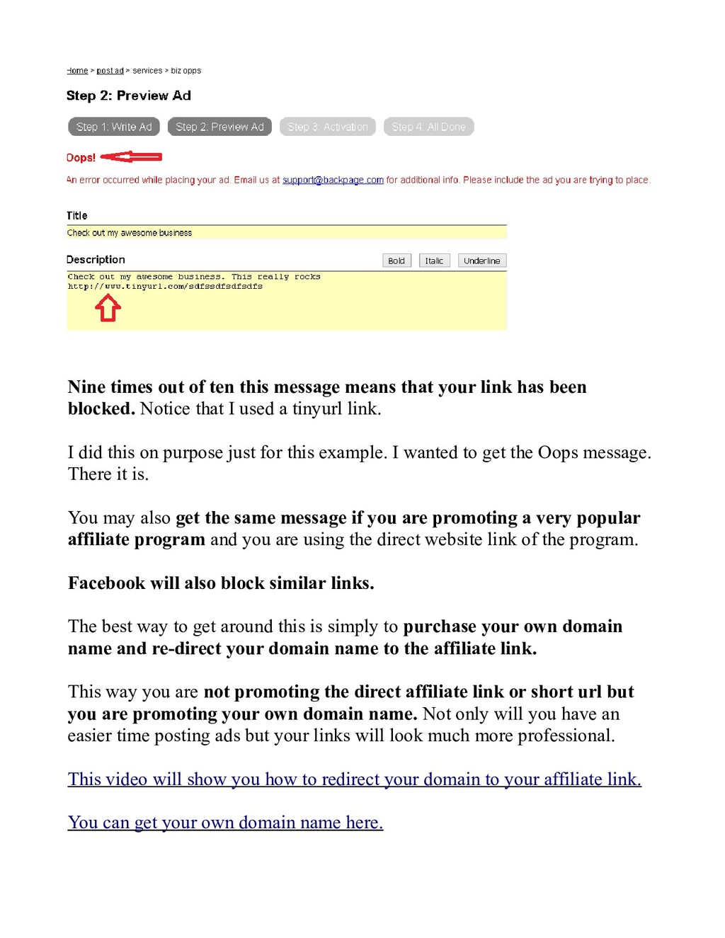 link has been blocked. Notice that I used a tinyurl link. I did this on purpose just for this example. I wanted to get the Oops message. There it is. You may also get the same message if you are promoting a very popular affiliate program and you are using the direct website link of the program. Facebook will also block similar links. The best way to get around this is simply to purchase your own domain name and re-direct your domain name to the affiliate link. This way you are not promoting the direct affiliate link or short url but you are promoting your own domain name. Not only will you have an easier time posting ads but your links will look much more professional. This video will show you how to redirect your domain to your affiliate link. You can get your own domain name here.