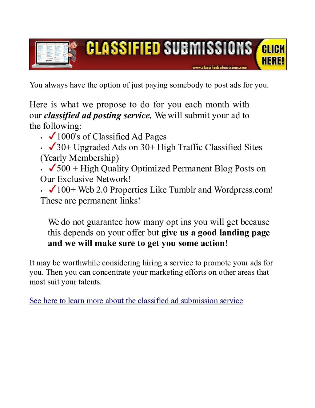 post ads for you. Here is what we propose to do for you each month with our classified ad posting service. We will submit your ad to the following: • 1000's of Classified Ad Pages • 30+ Upgraded Ads on 30+ High Traffic Classified Sites (Yearly Membership) • 500 + High Quality Optimized Permanent Blog Posts on Our Exclusive Network! • 100+ Web 2.0 Properties Like Tumblr and Wordpress.com! These are permanent links! We do not guarantee how many opt ins you will get because this depends on your offer but give us a good landing page and we will make sure to get you some action! It may be worthwhile considering hiring a service to promote your ads for you. Then you can concentrate your marketing efforts on other areas that most suit your talents. See here to learn more about the classified ad submission service
